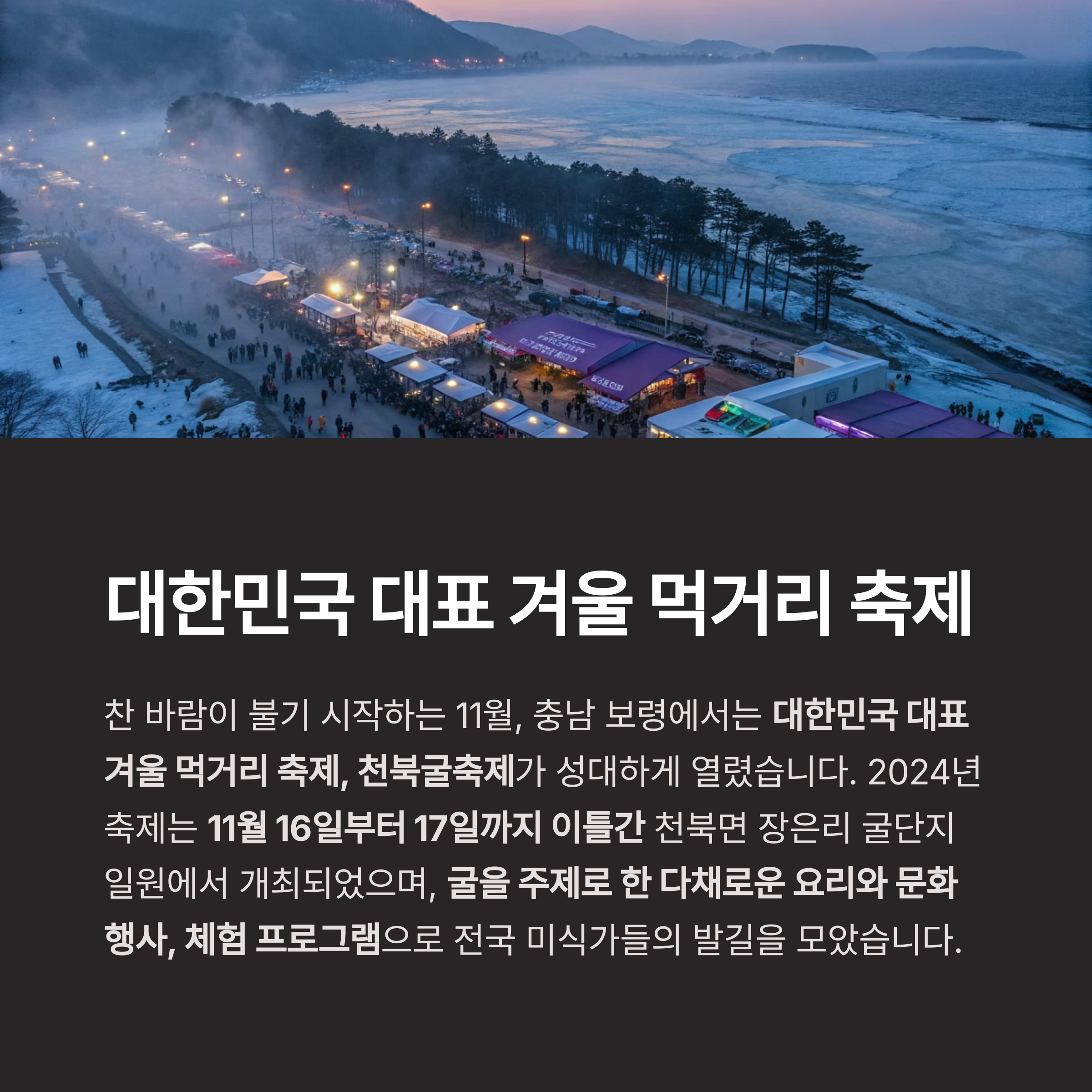 대한민국 대표 겨울 먹거리 축제, 천북굴축제가 성대하게 열렸습니다.