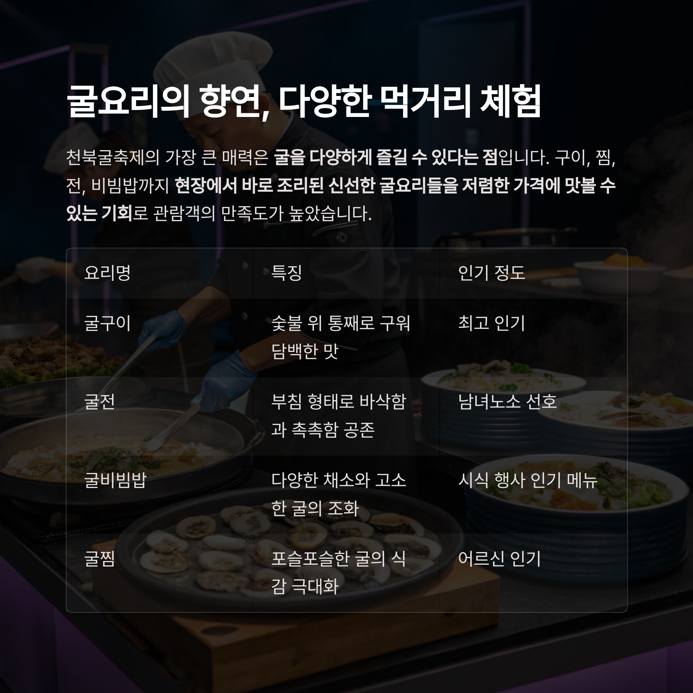 현장에서 바로 조리된 신선한 굴요리들을 저렴한 가격에 맛볼 수 있는 기회로