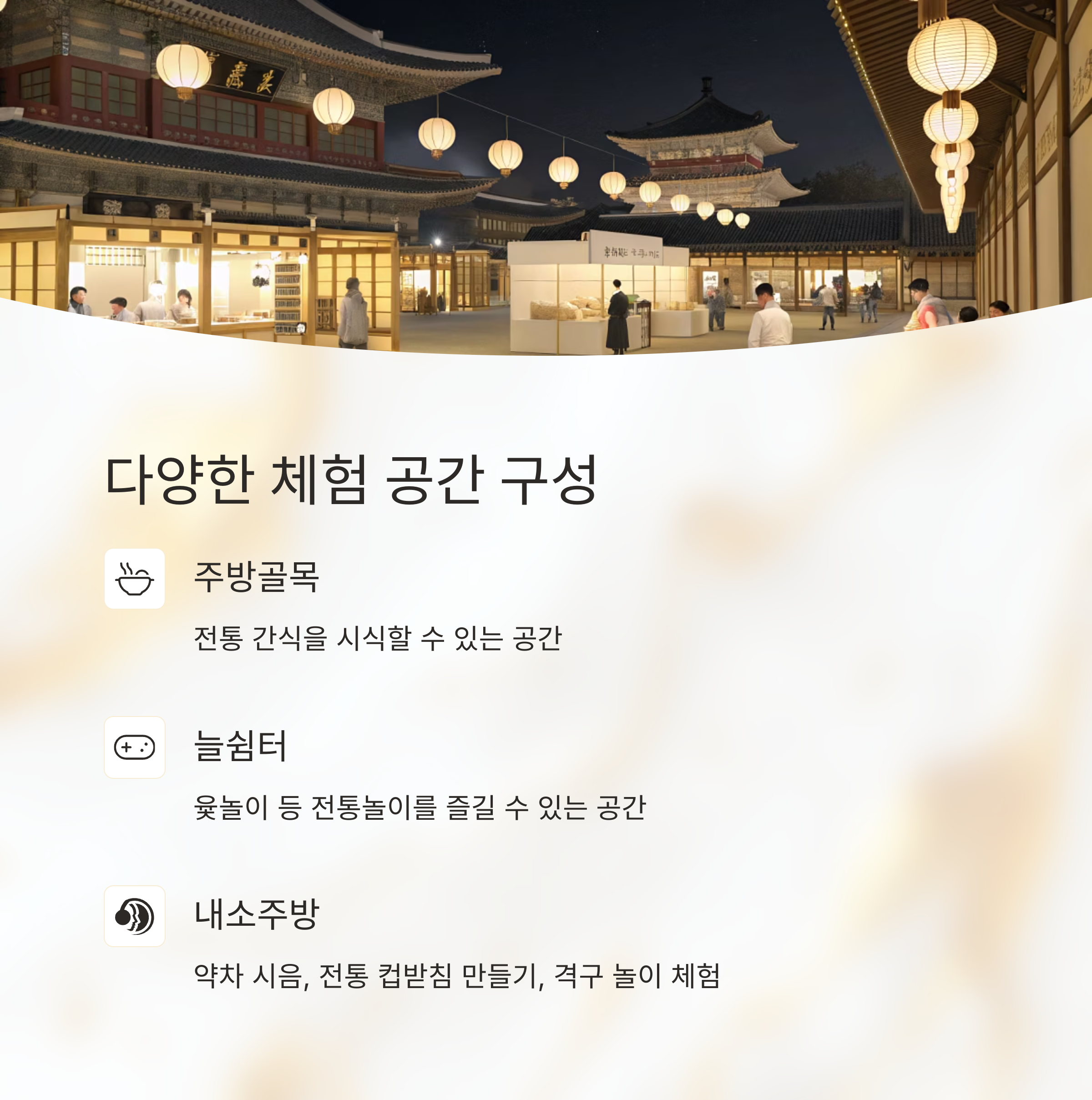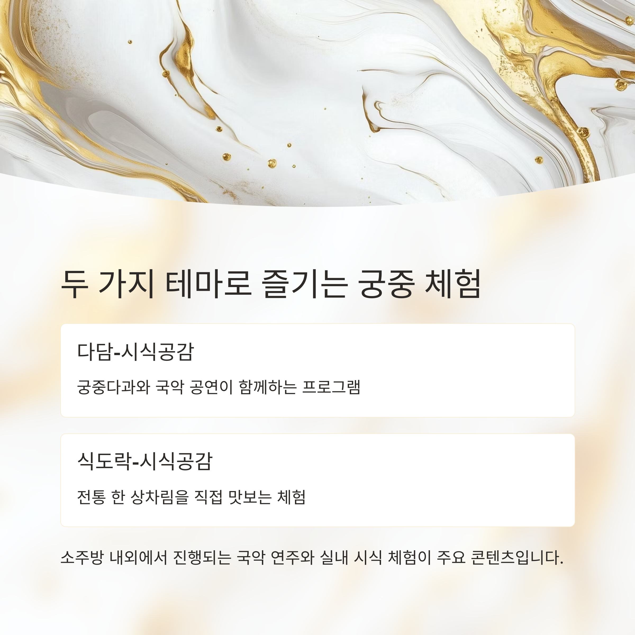 소주방 내외에서 진행되는 국악 연주와 실내 시식 체험이 주요 콘텐츠입니다.