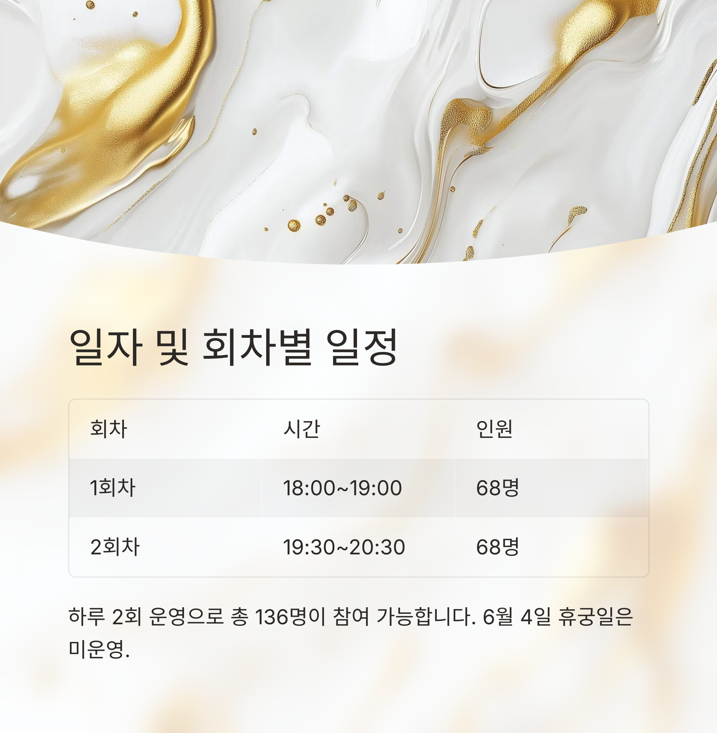 | 1회차 | 18:00 ~ 19:00 | 68명 |