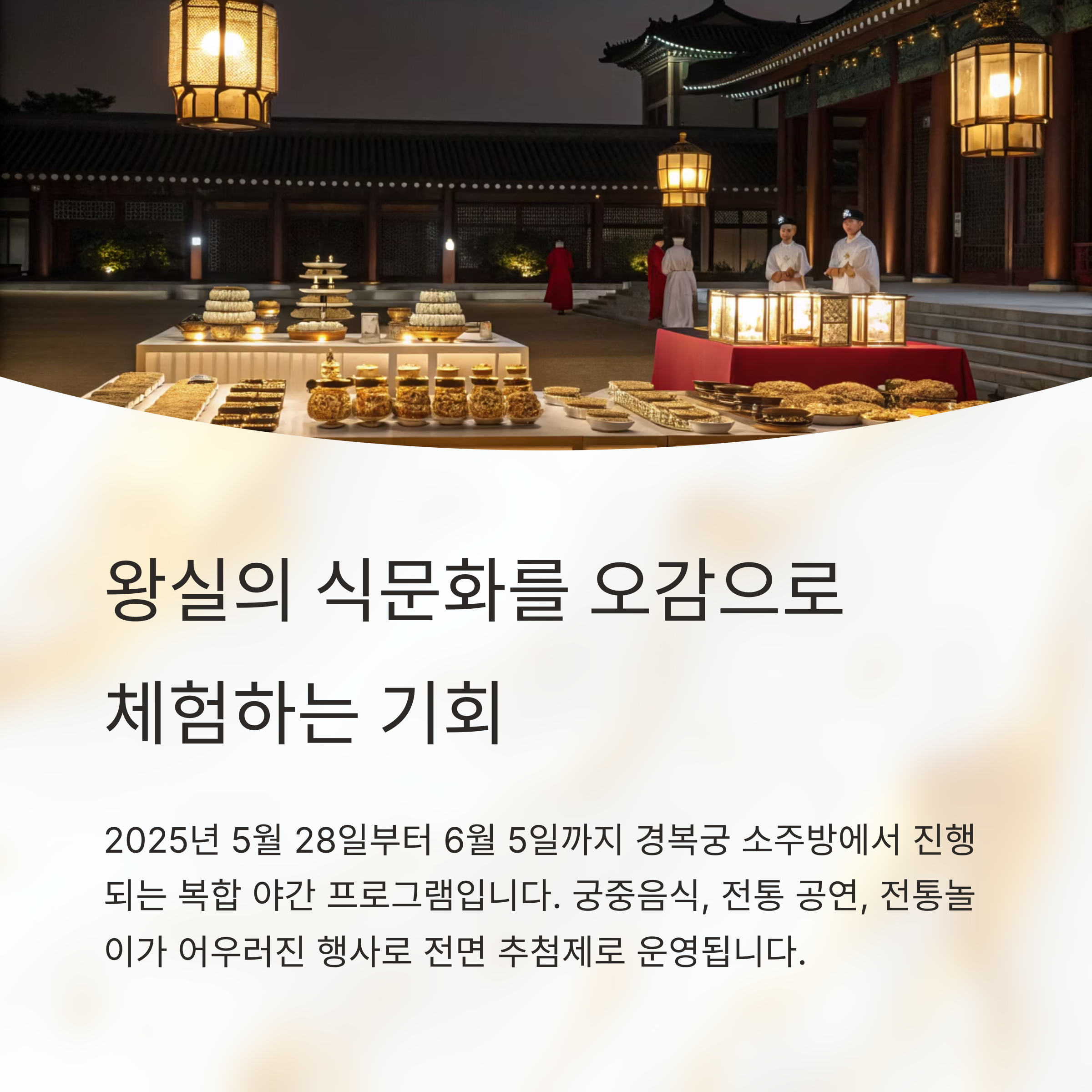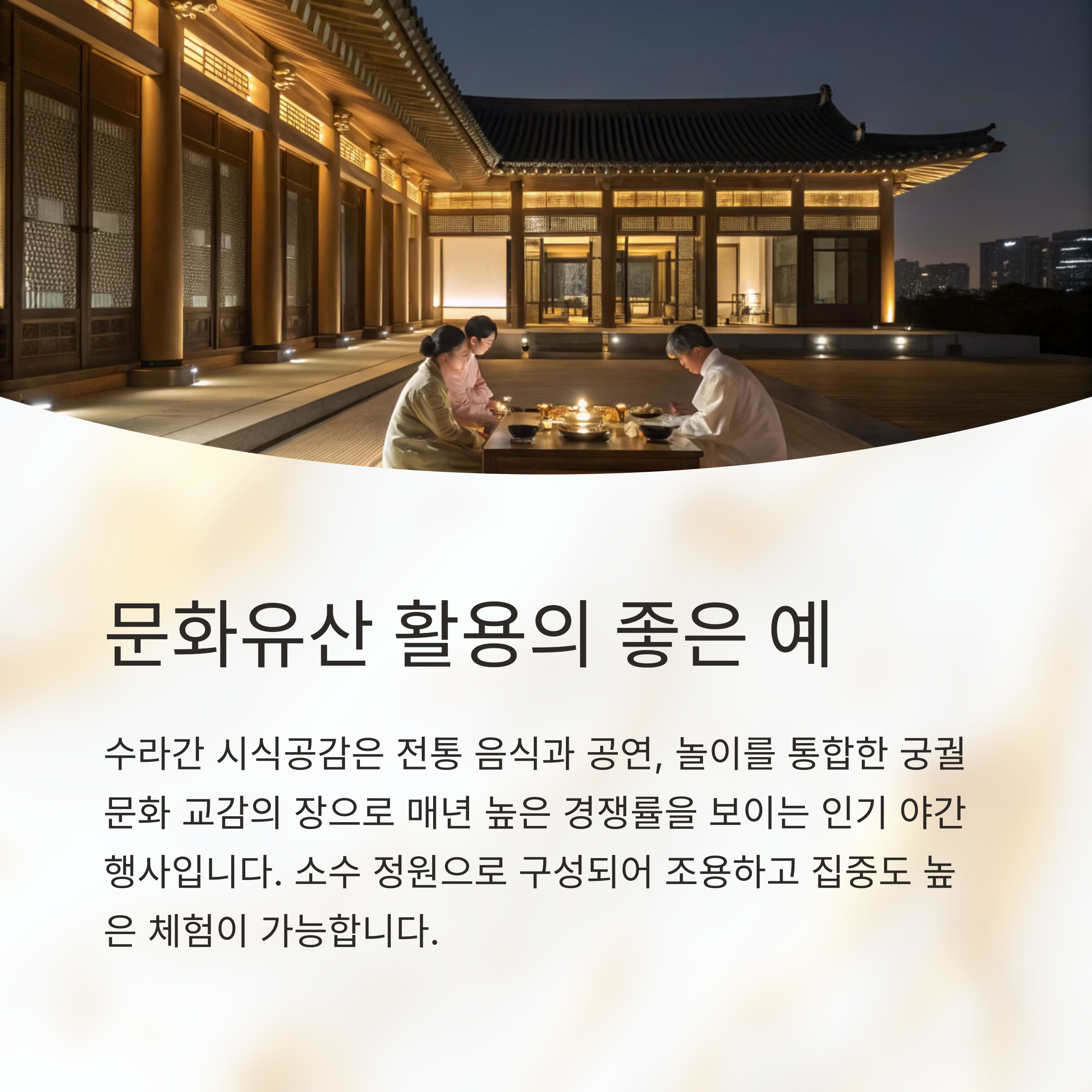 **궁중음식과 전통 공연, 전통놀이가 어우러진 복합 야간 프로그램 ‘수라간 시식공감’**이 진행됩니다.