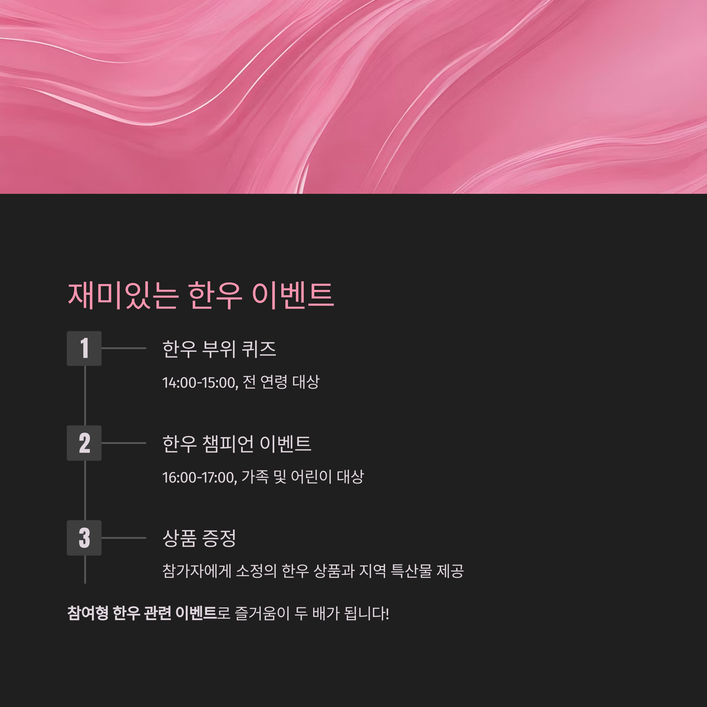 | 한우 부위 퀴즈 | 14:00~15:00 | 전 연령 |