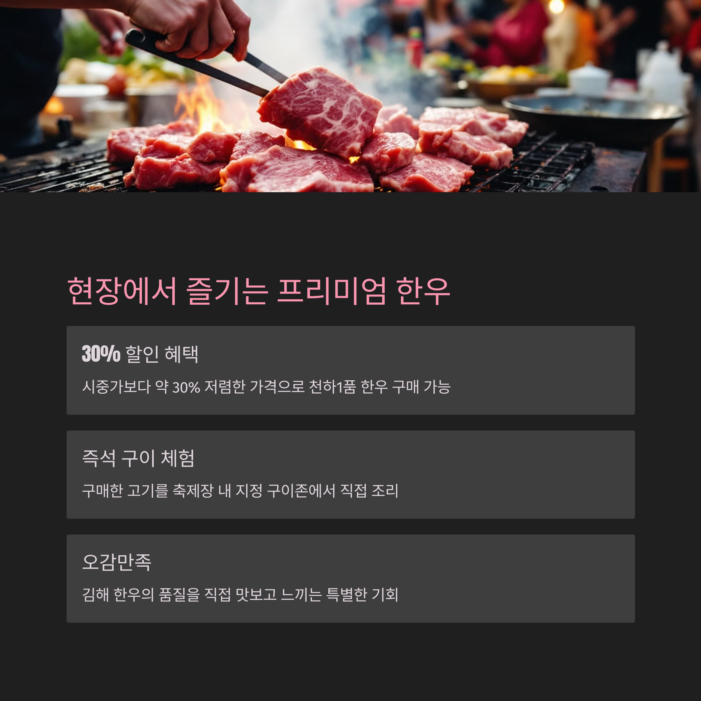 시중가보다 약 30% 저렴한 가격에 천하1품 한우를 구매하고 즉석에서 구워 먹을 수 있는