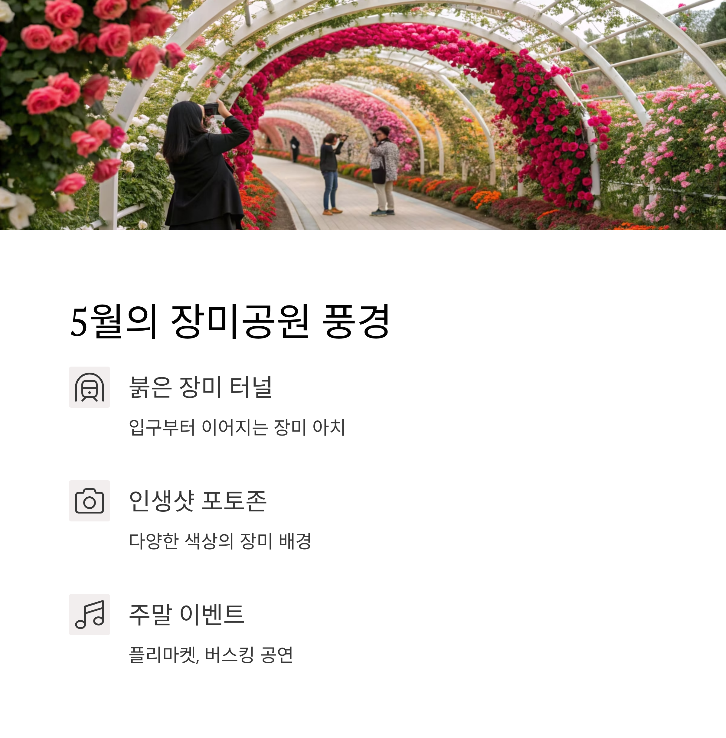 | 장미 아치 입구 | 오전 10~11시, 자연광 활용 역광 추천 |