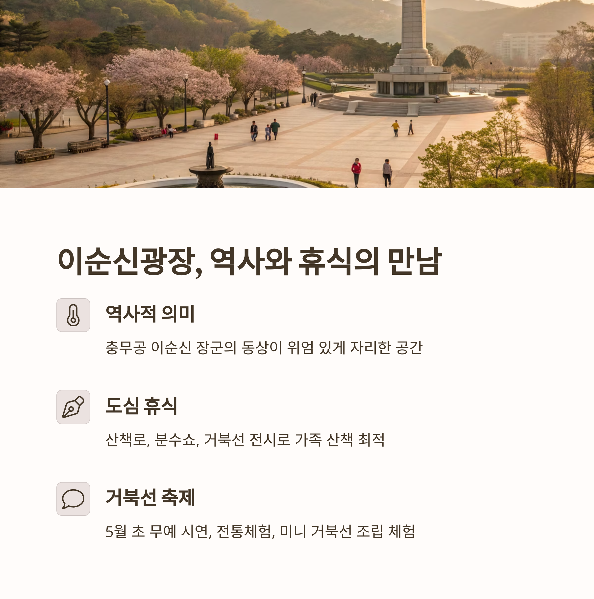 - 산책로 + 분수쇼 + 거북선 전시 공간