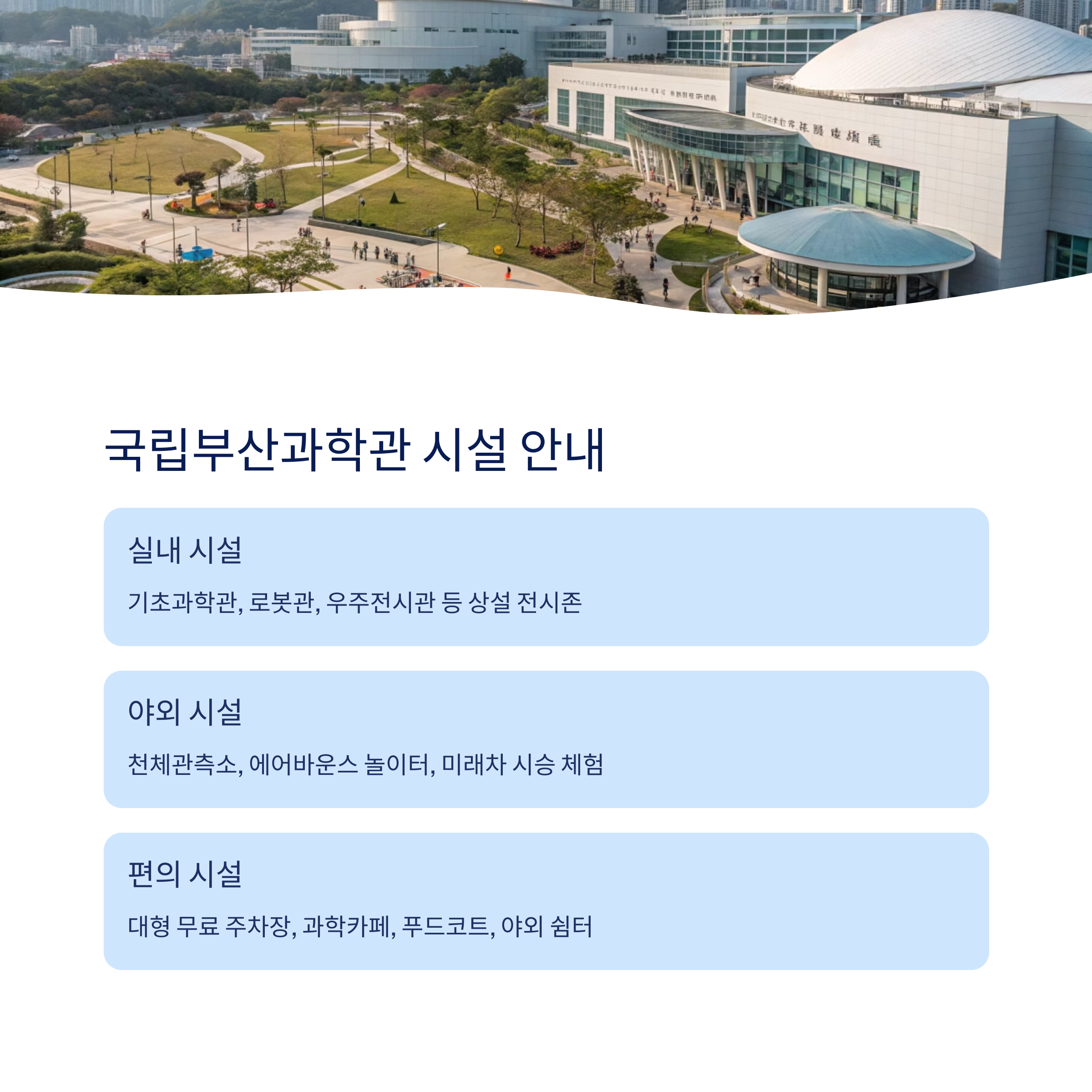 - 식음료: 과학카페, 푸드코트, 야외 쉼터
