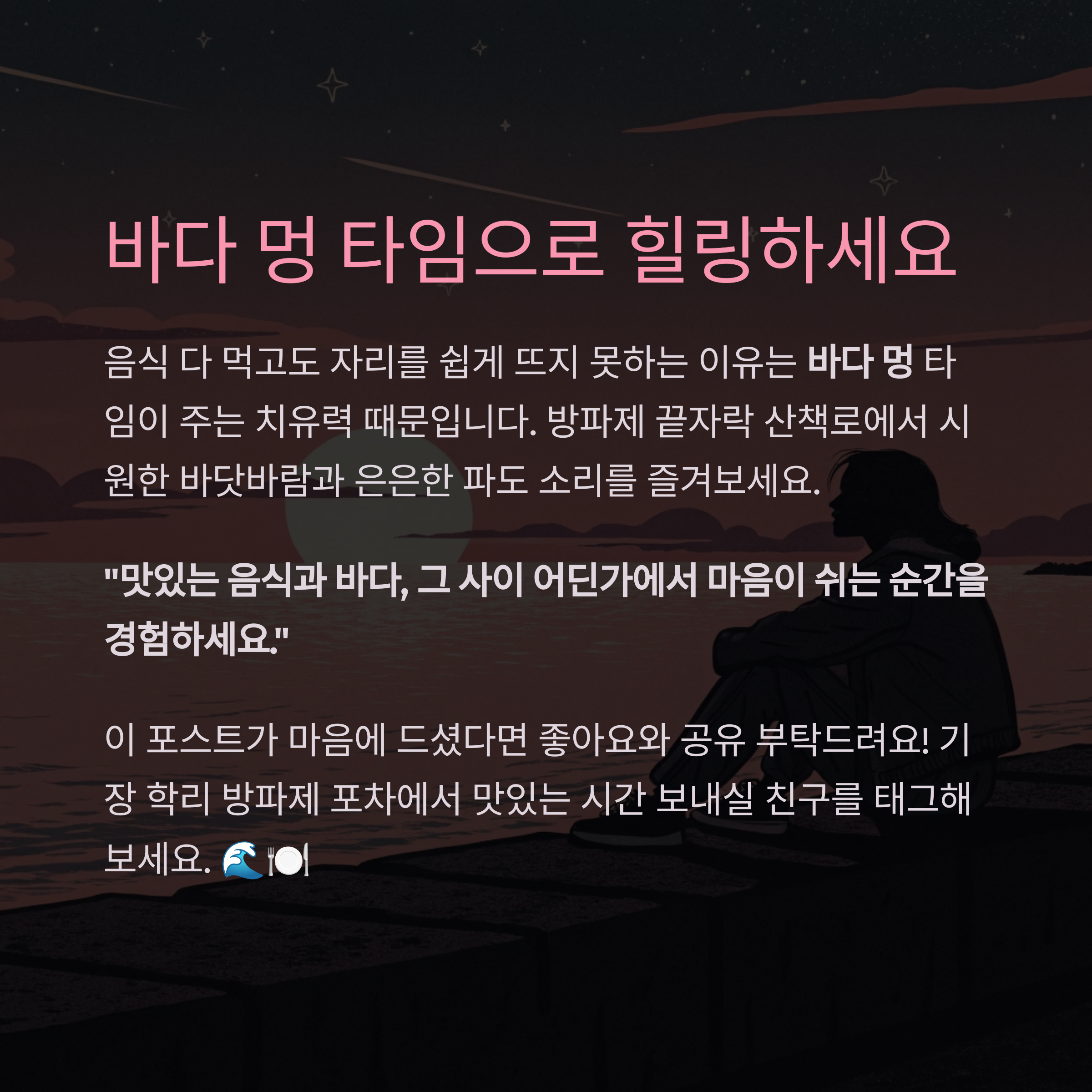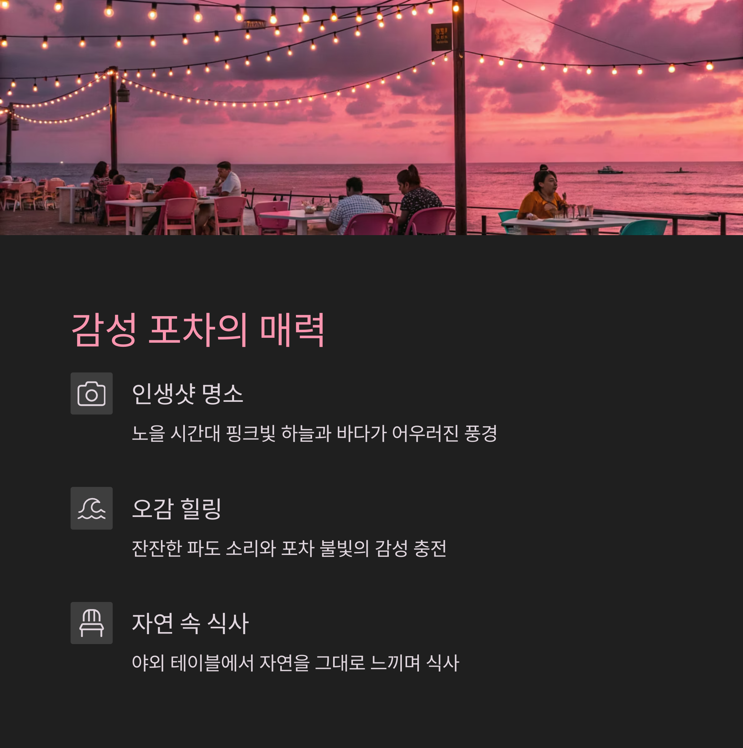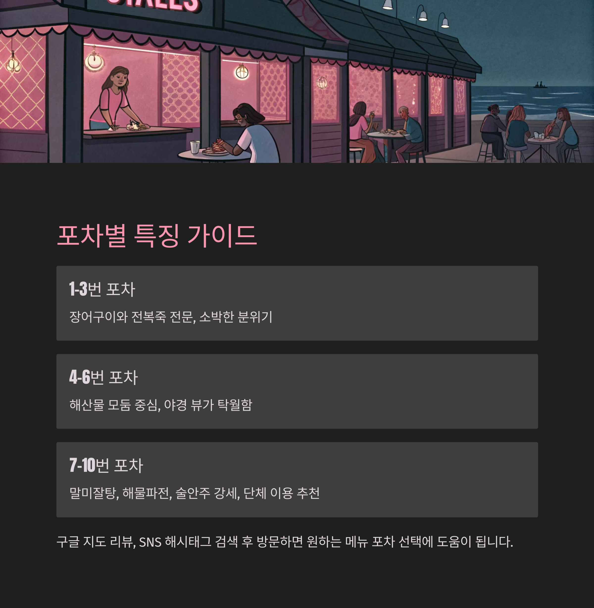 - 밤에는 포장마차 불빛과 잔잔한 파도 소리로 감성 충전