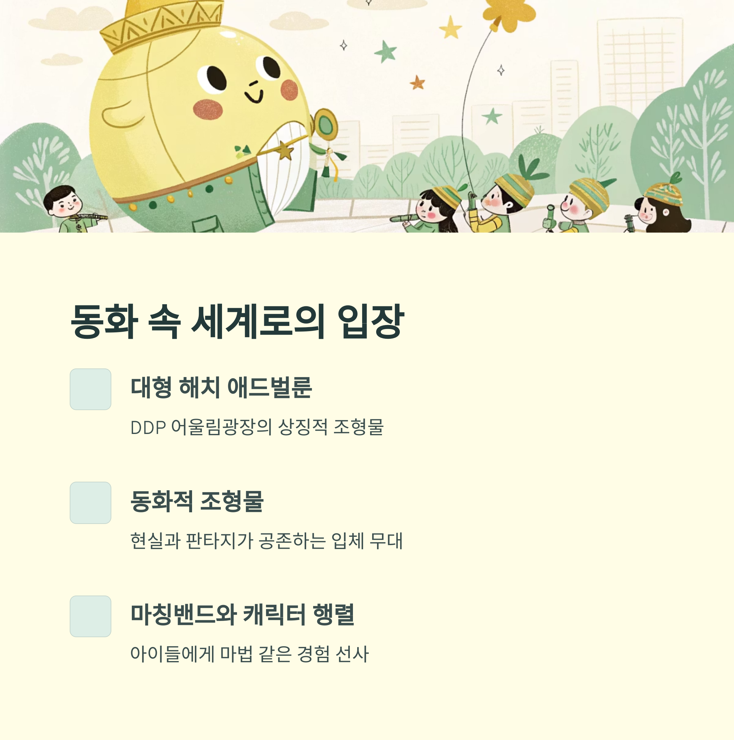 동화적 조형물들이 설치되어 현실과 판타지가 공존하는 입체 무대를 연출합니다.