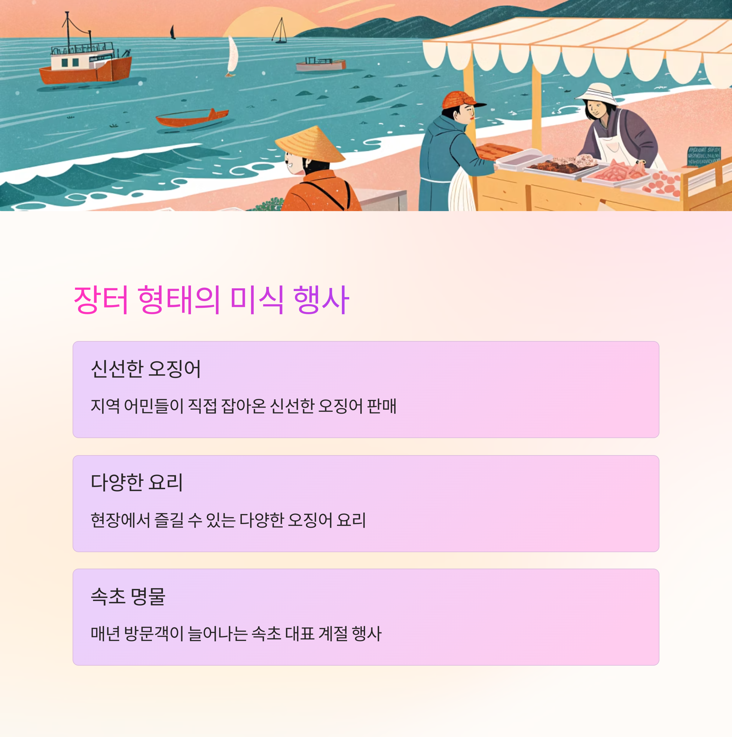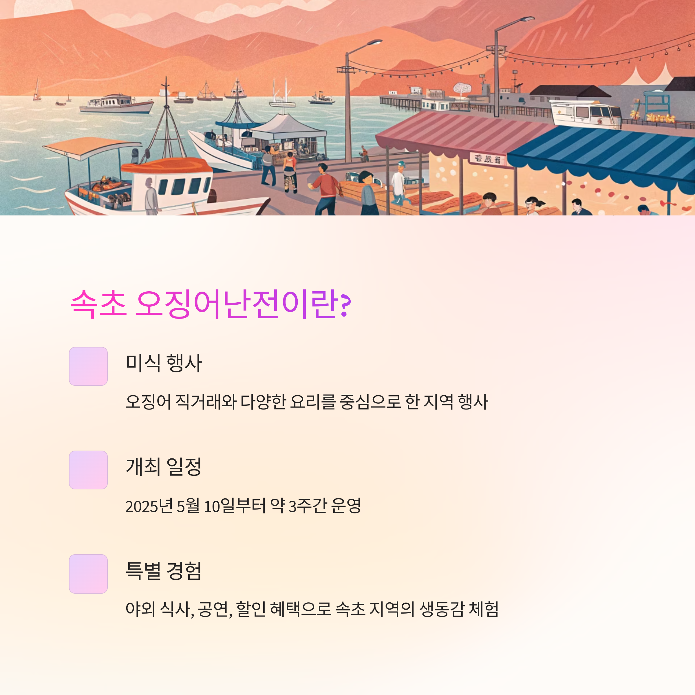 속초오징어난전은 공식적인 축제라기보다는 **"장터 형태의 미식 행사"**에 가깝습니다.