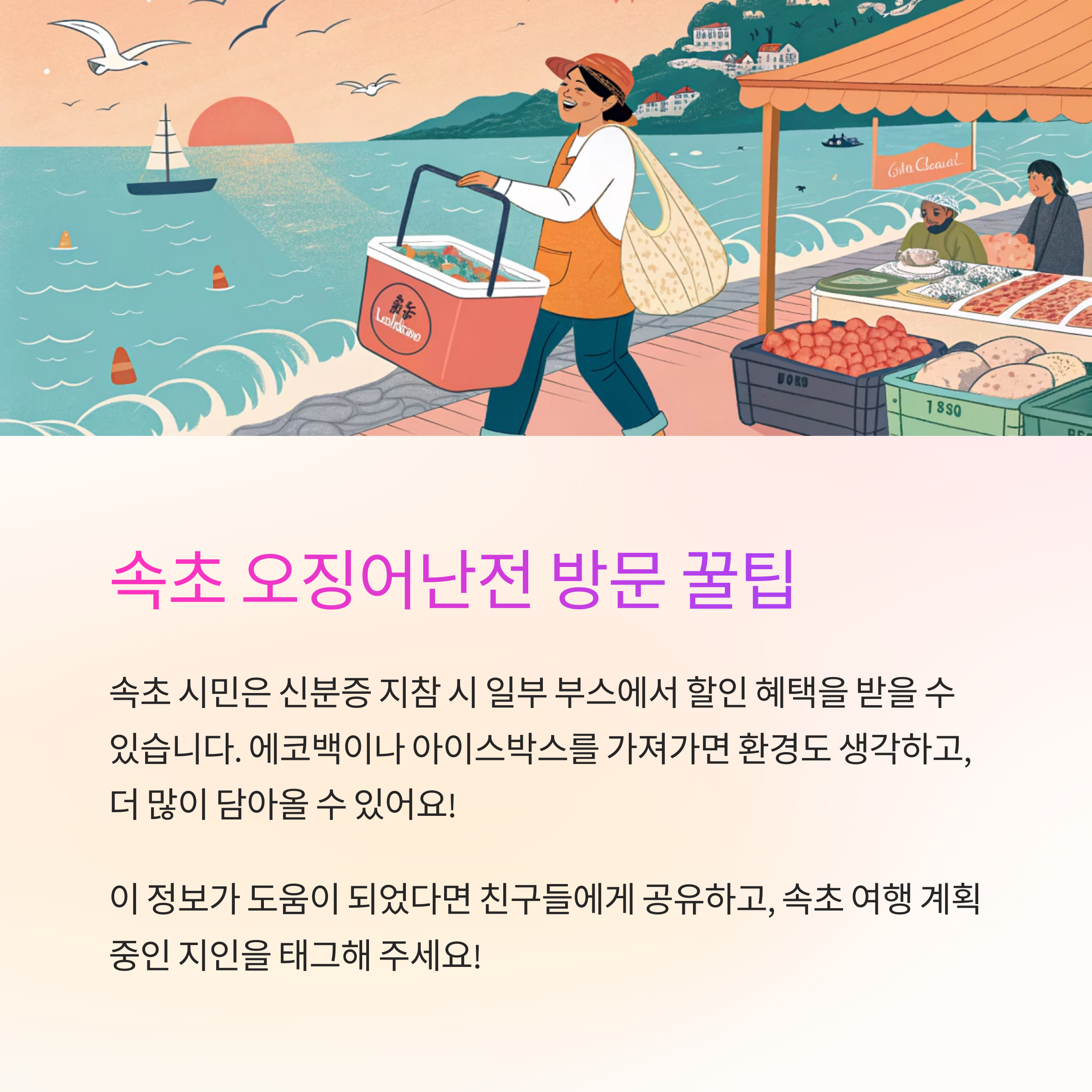 단순한 판매장을 넘어, 야외 식사와 공연, 할인 혜택, 참여 이벤트까지 더해져 속초 지역만의 생동감을 제대로 경험할 수 있습니다.