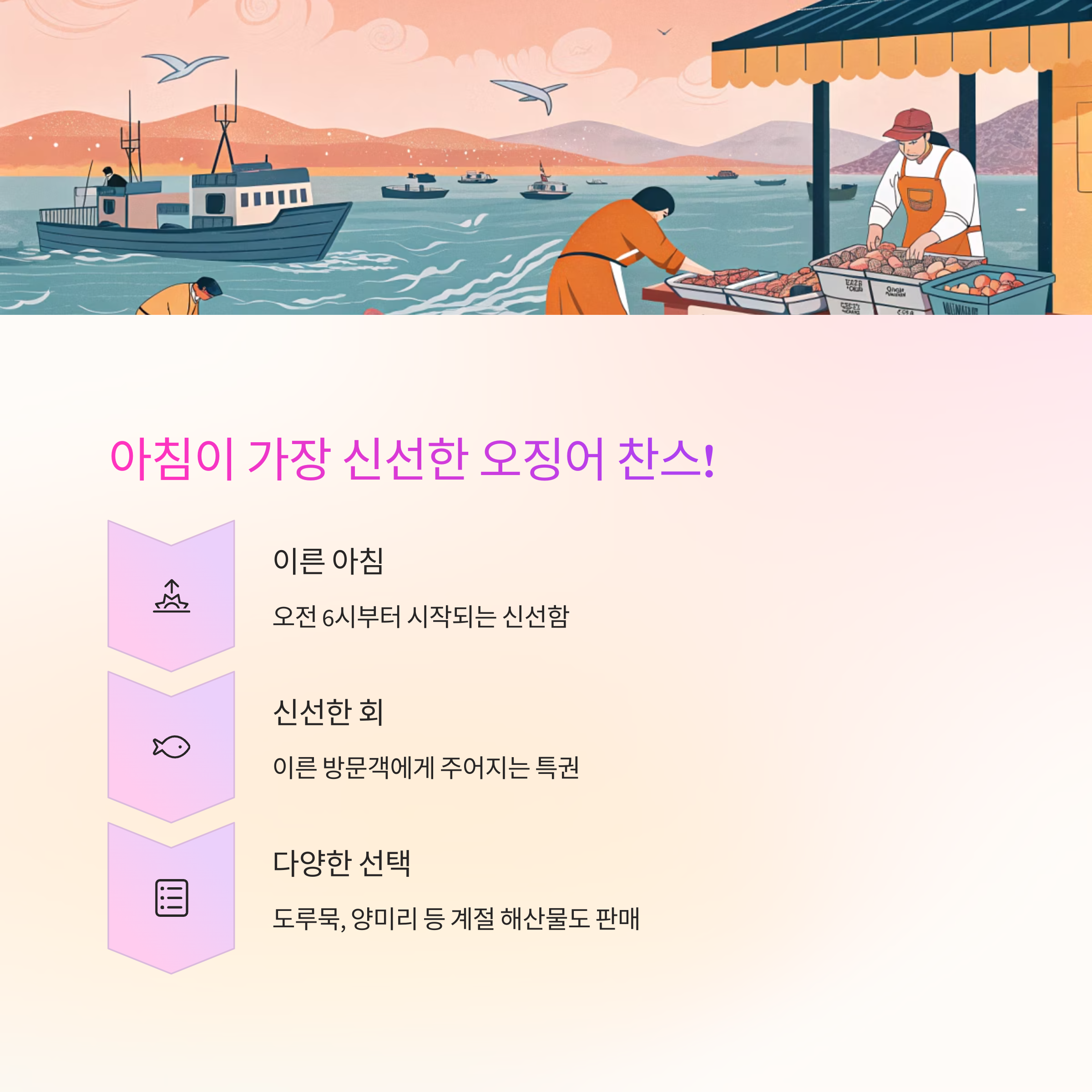 지역 어민들이 직접 잡아온 신선한 오징어를 판매하고, 현장에서 다양한 요리로 즐길 수 있도록 준비돼 있습니다.