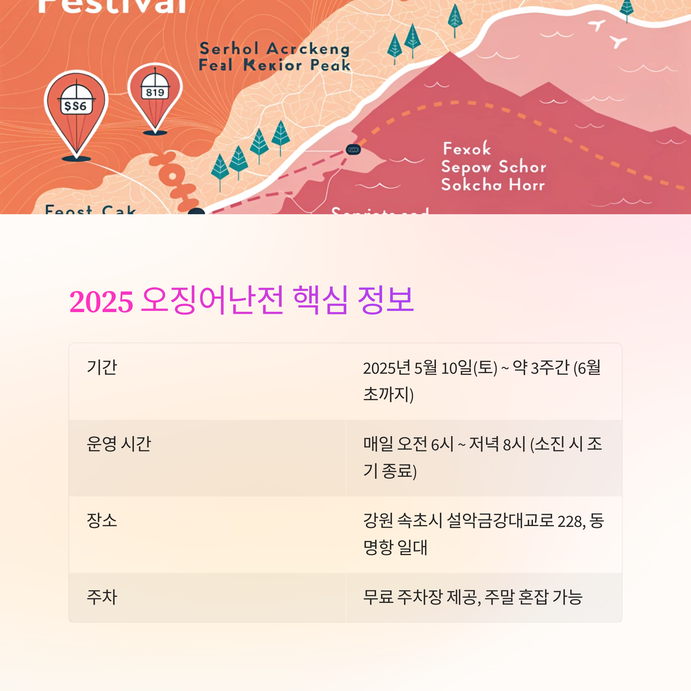 2025년에도 5월 10일부터 약 3주간 운영되며, 신선한 해산물과 함께 속초의 바다 풍경을 동시에 즐길 수 있는 기회입니다.