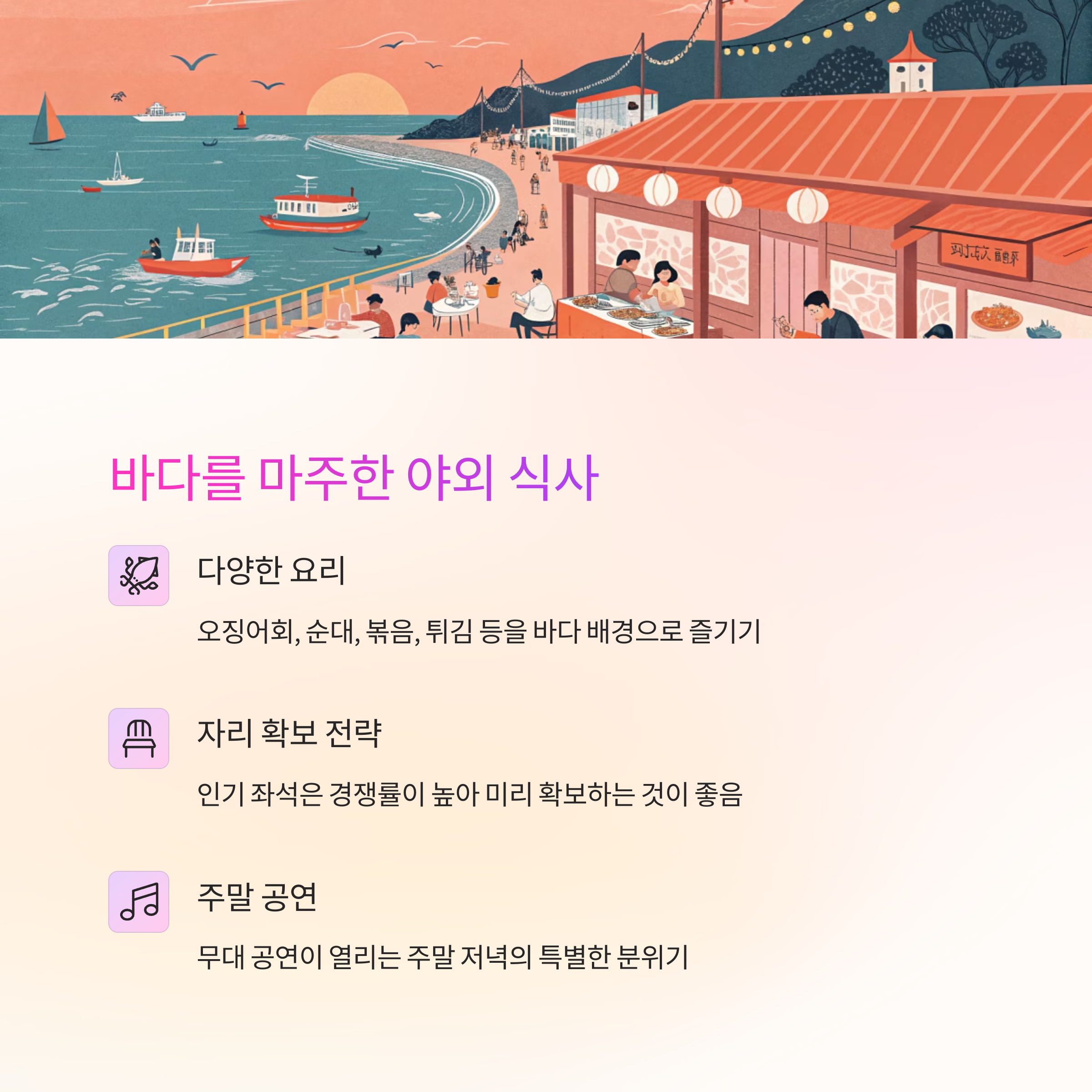 오징어회, 순대, 볶음, 튀김 등 다양한 요리를 바다를 배경으로 즐길 수 있습니다.