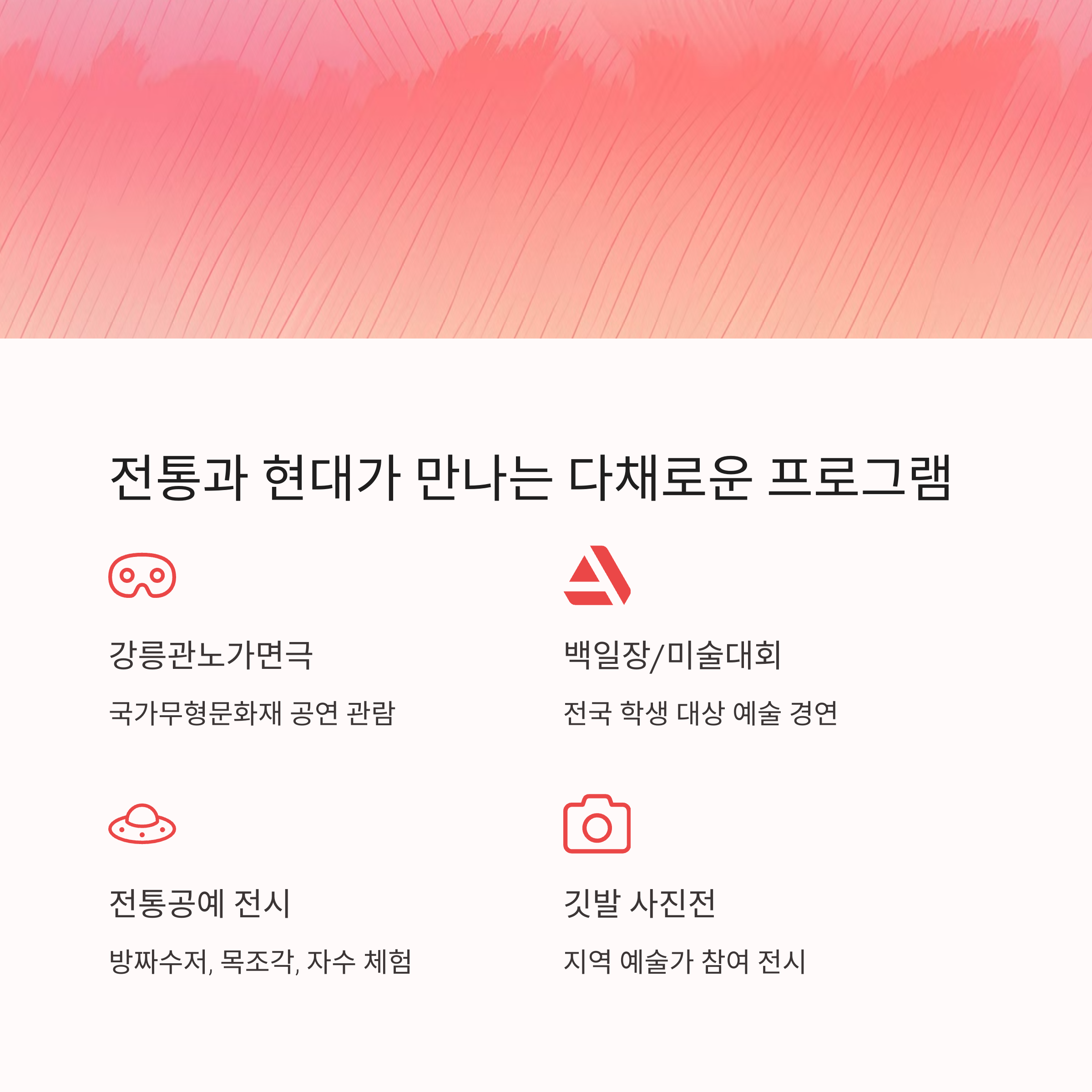 | 강릉관노가면극 | 국가무형문화재 공연 | 관람 가능 |