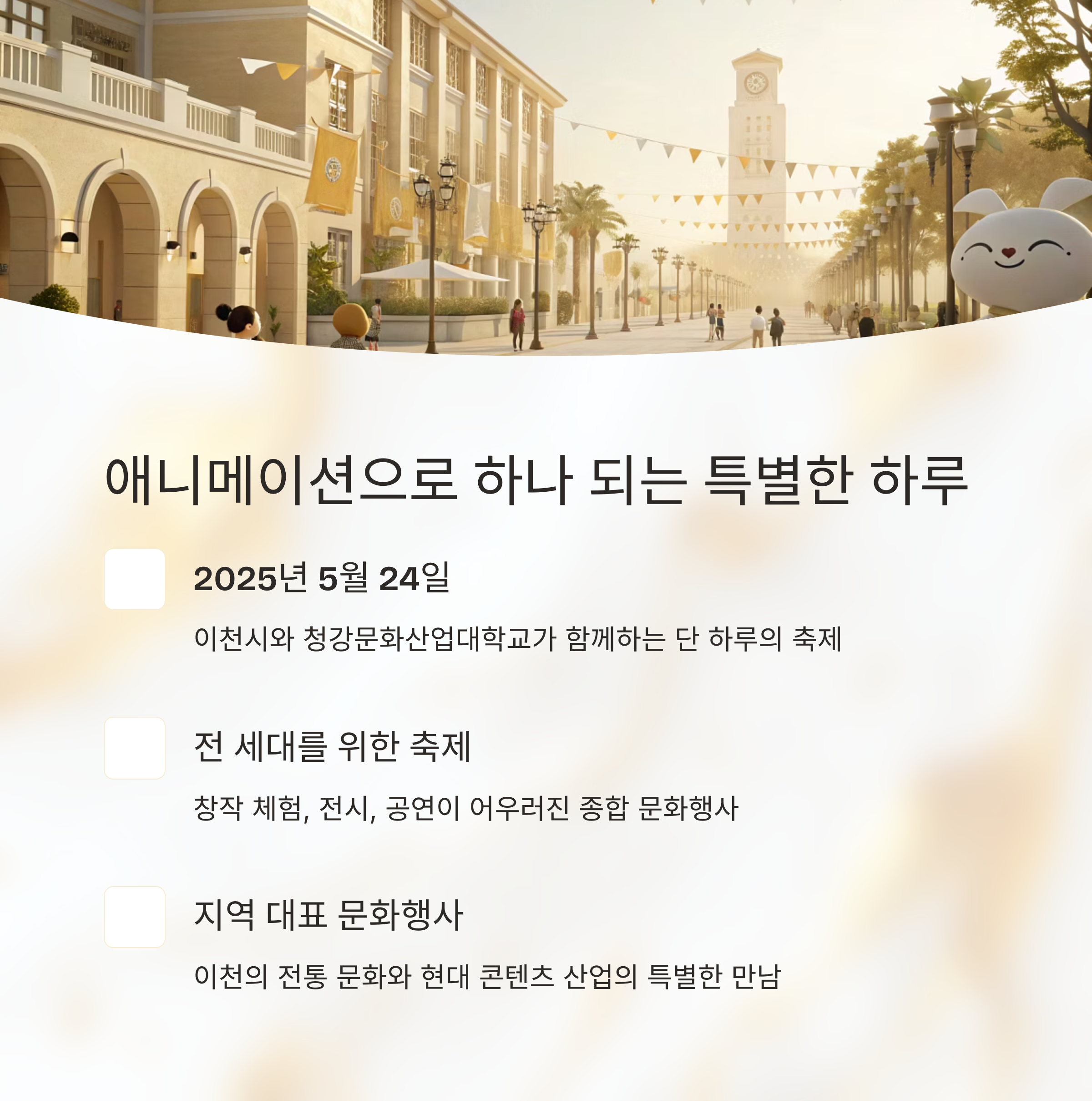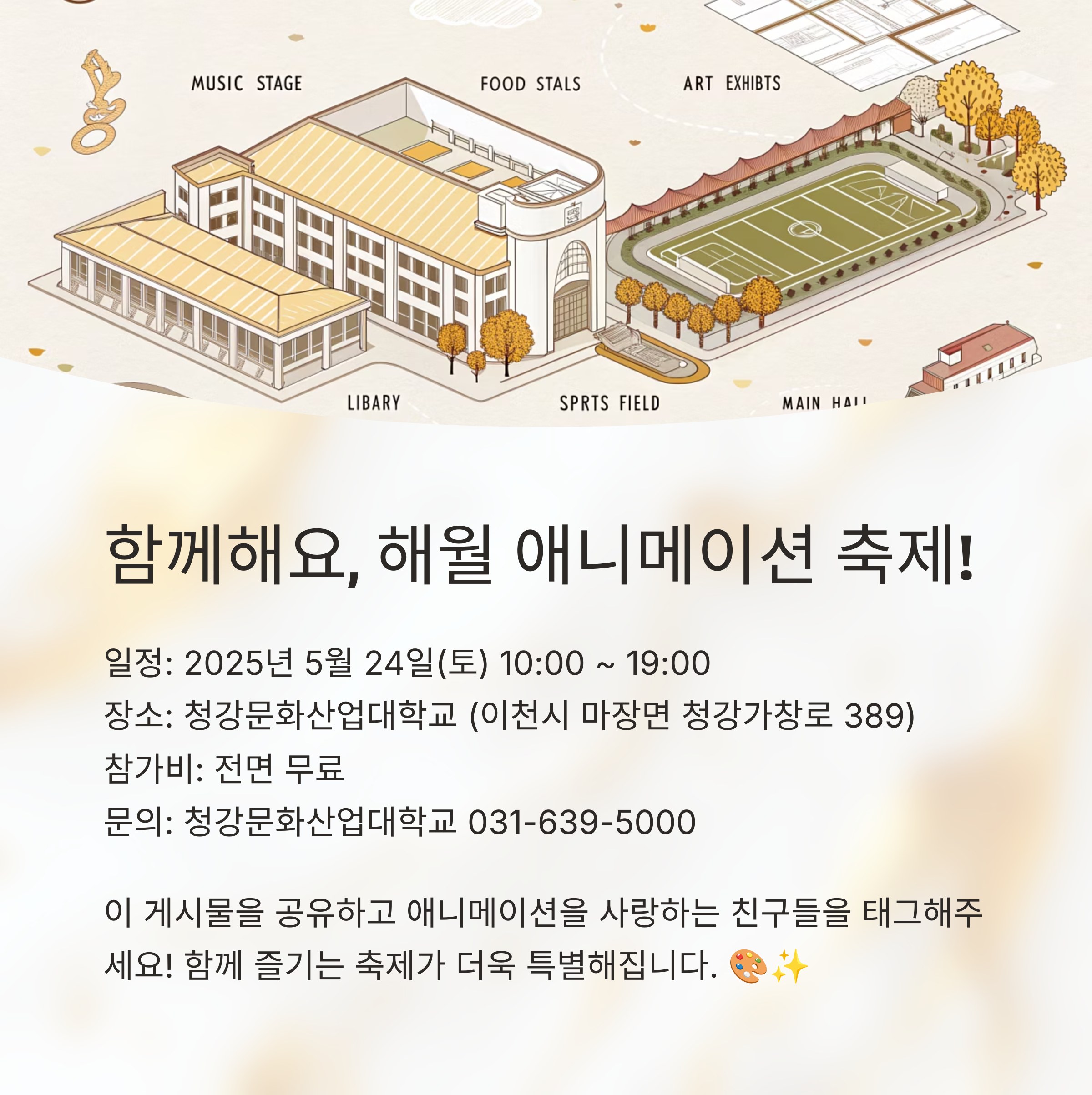**‘해월 애니메이션 축제’**가 경기도 이천시 청강문화산업대학교 캠퍼스에서 개최됩니다.