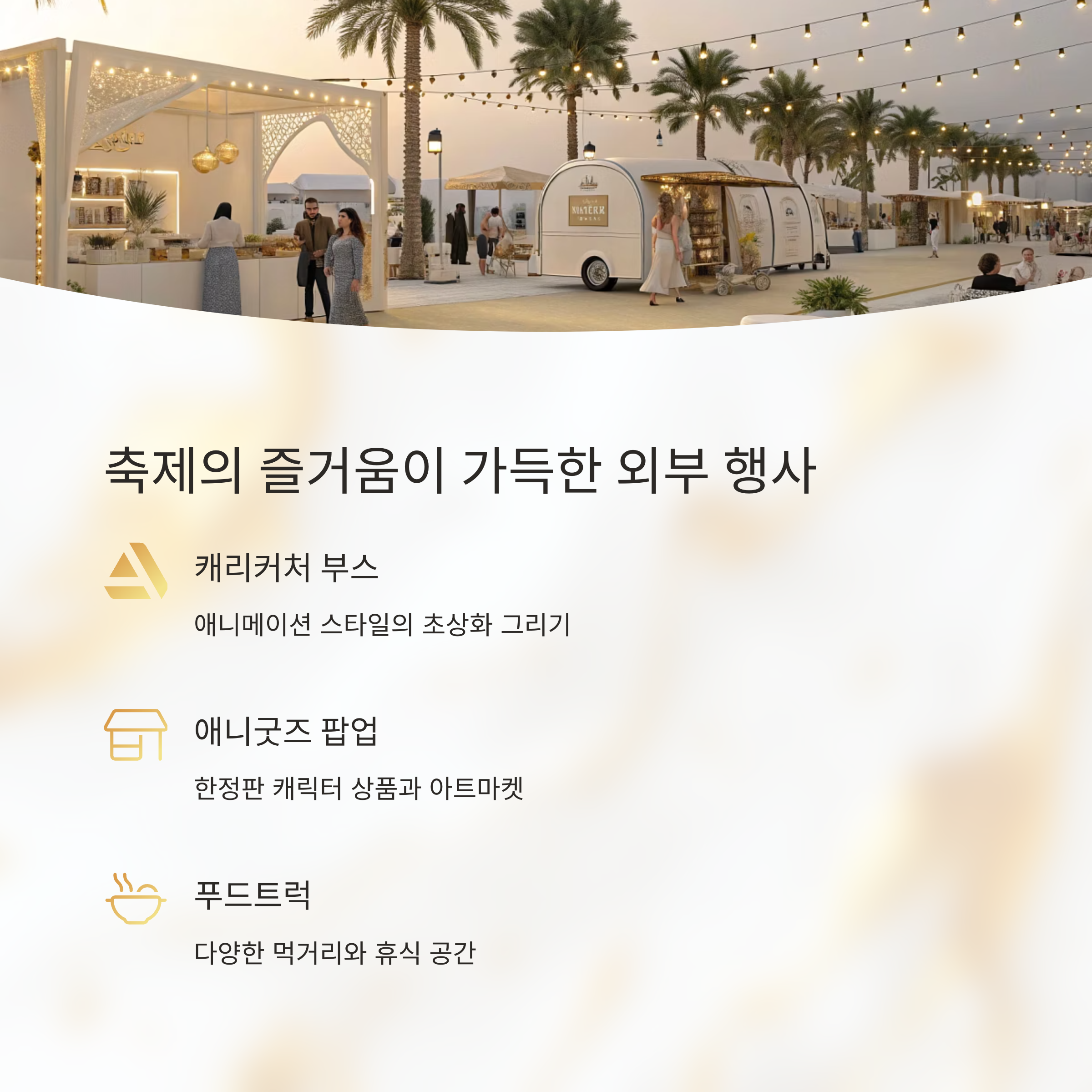행사장 외부에는 캐리커처 부스, 애니굿즈 팝업전시, 푸드트럭, 아트마켓 등