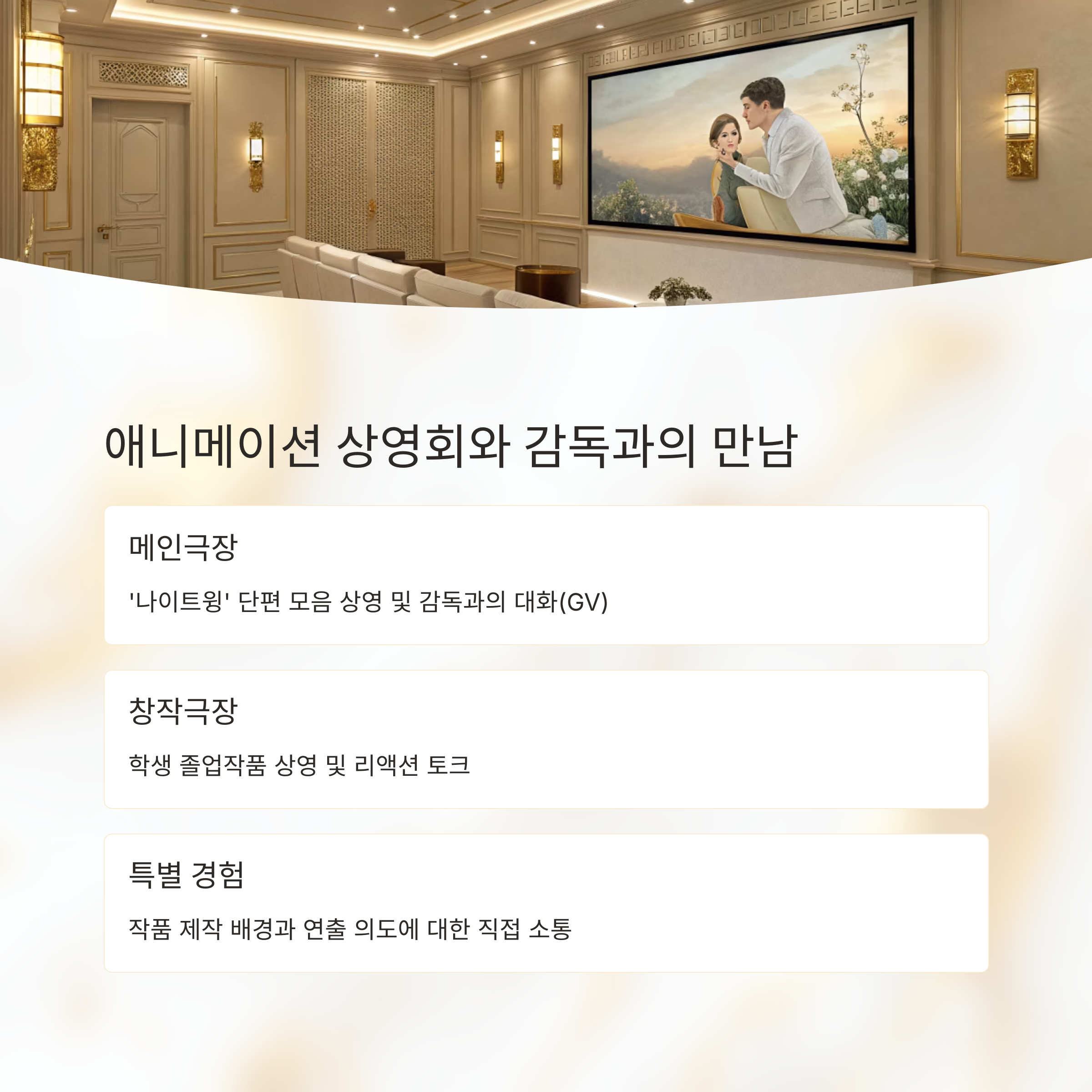 다양한 국내외 단편 애니메이션이 상영되며, 일부 작품은 감독과의 대화(GV)가 함께 진행됩니다.