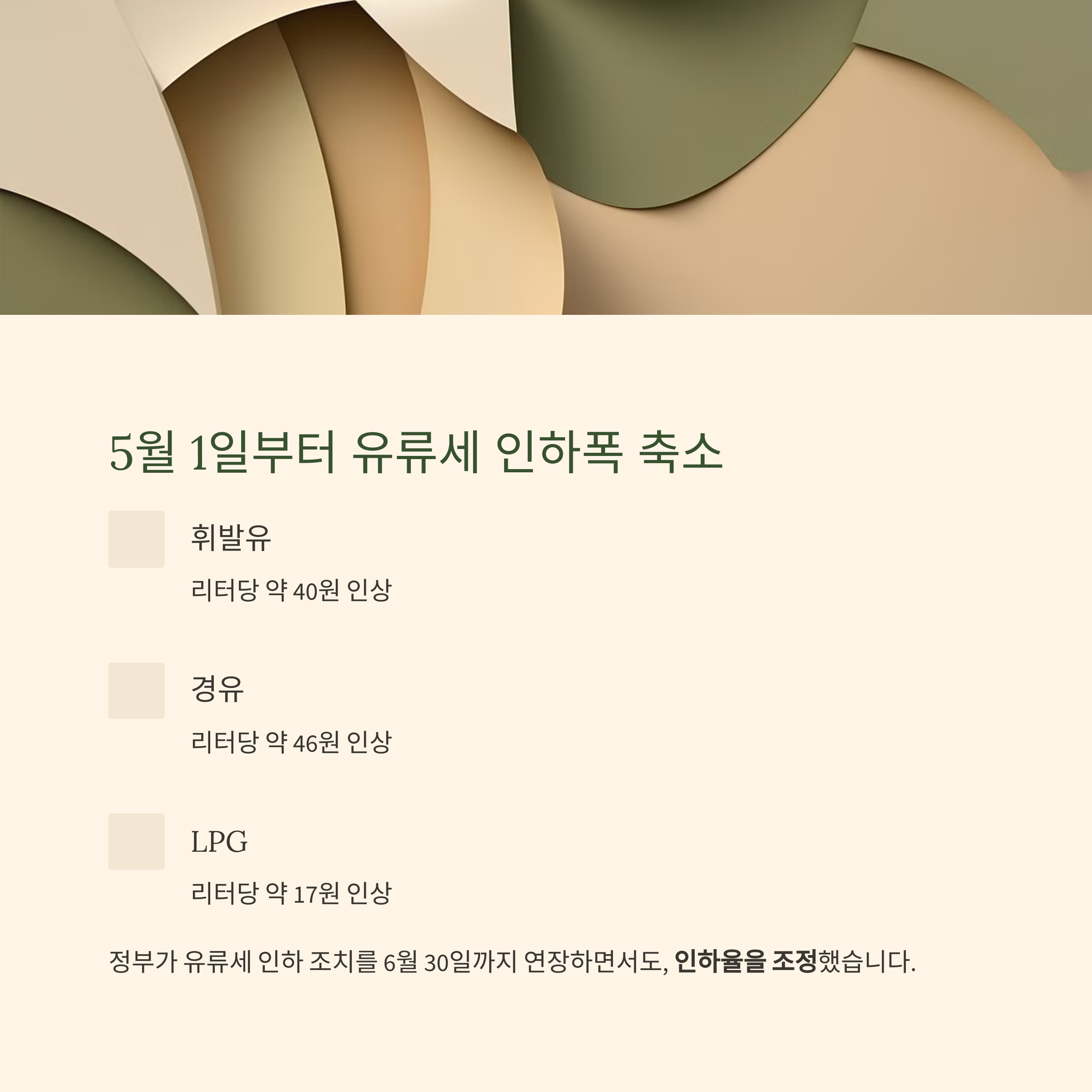 2025년 5월 1일부터 유류세 인하 폭이 축소되며, 전국적으로 휘발유, 경유, LPG 가격이 인상됩니다.