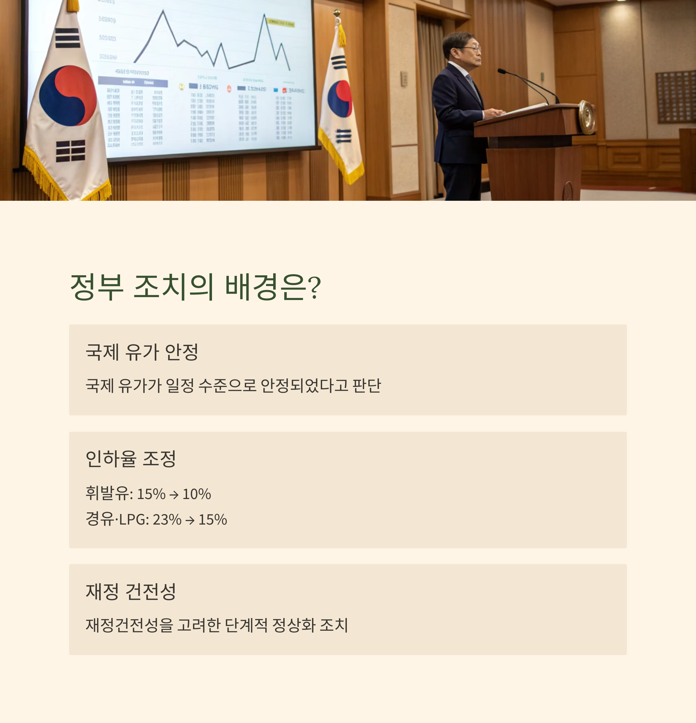 "재정 부담과 국제유가 안정세가 이번 조정의 핵심 배경입니다."