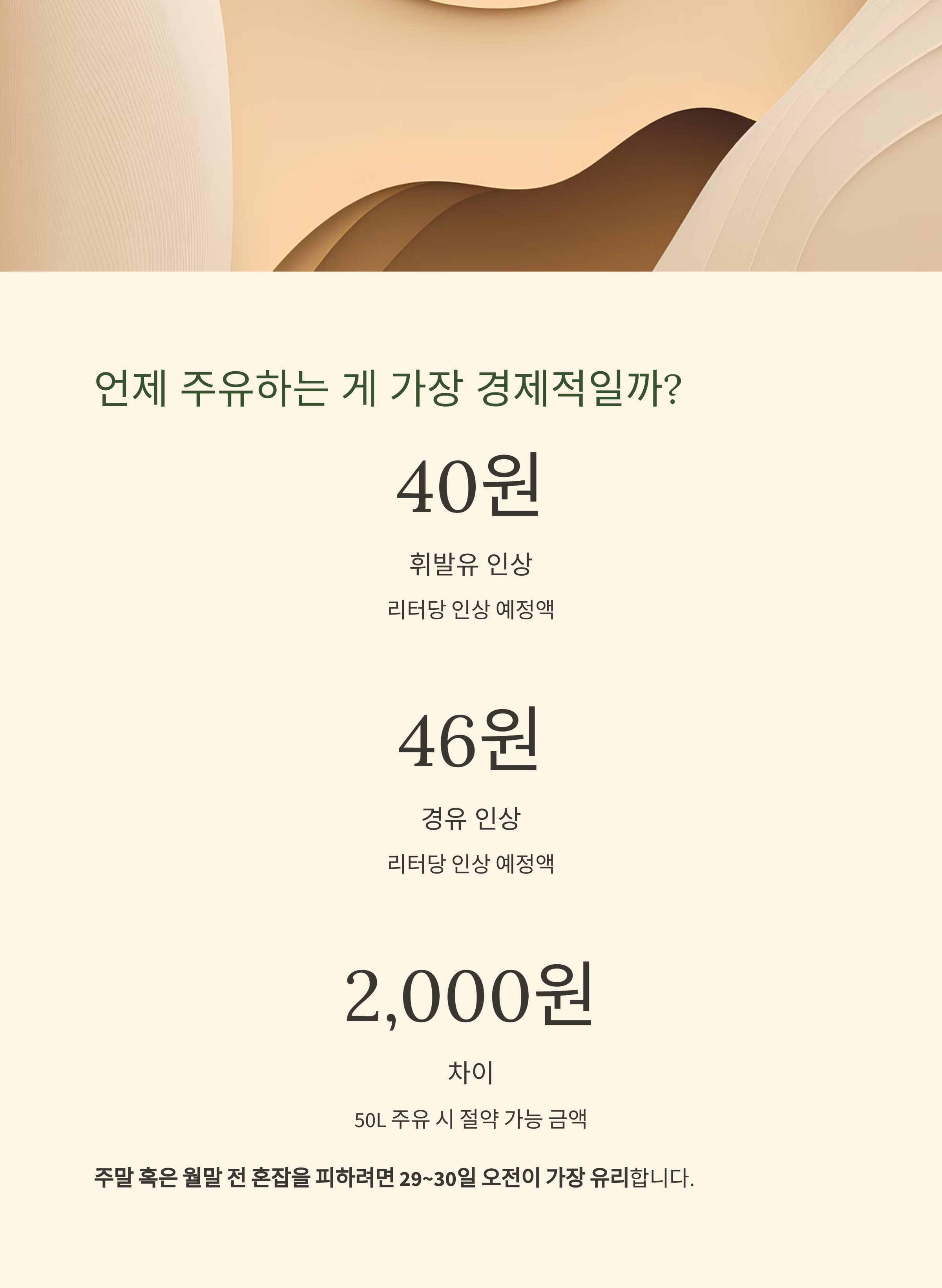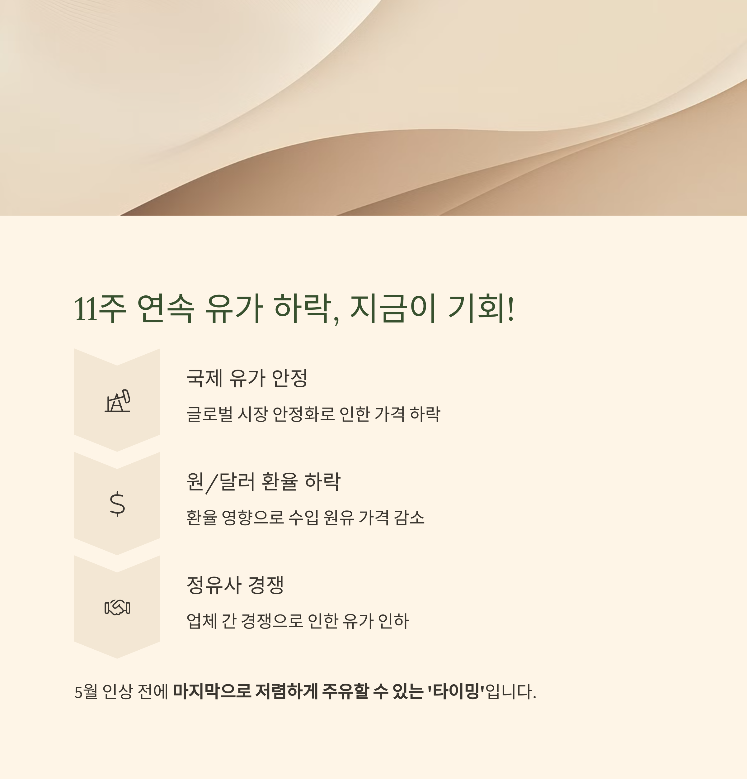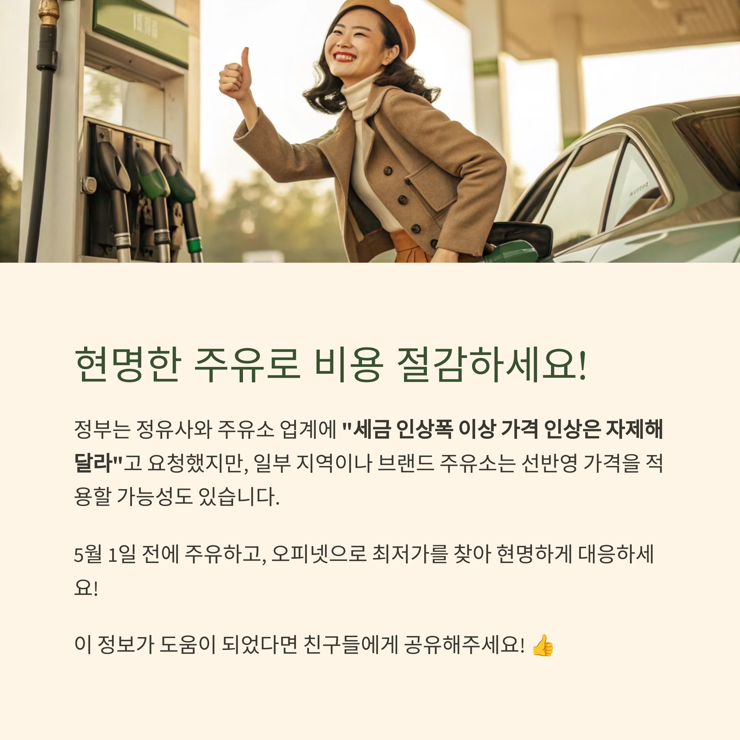 따라서 5월 인상 전에 **마지막으로 저렴하게 주유할 수 있는 ‘타이밍’**일 수 있습니다.