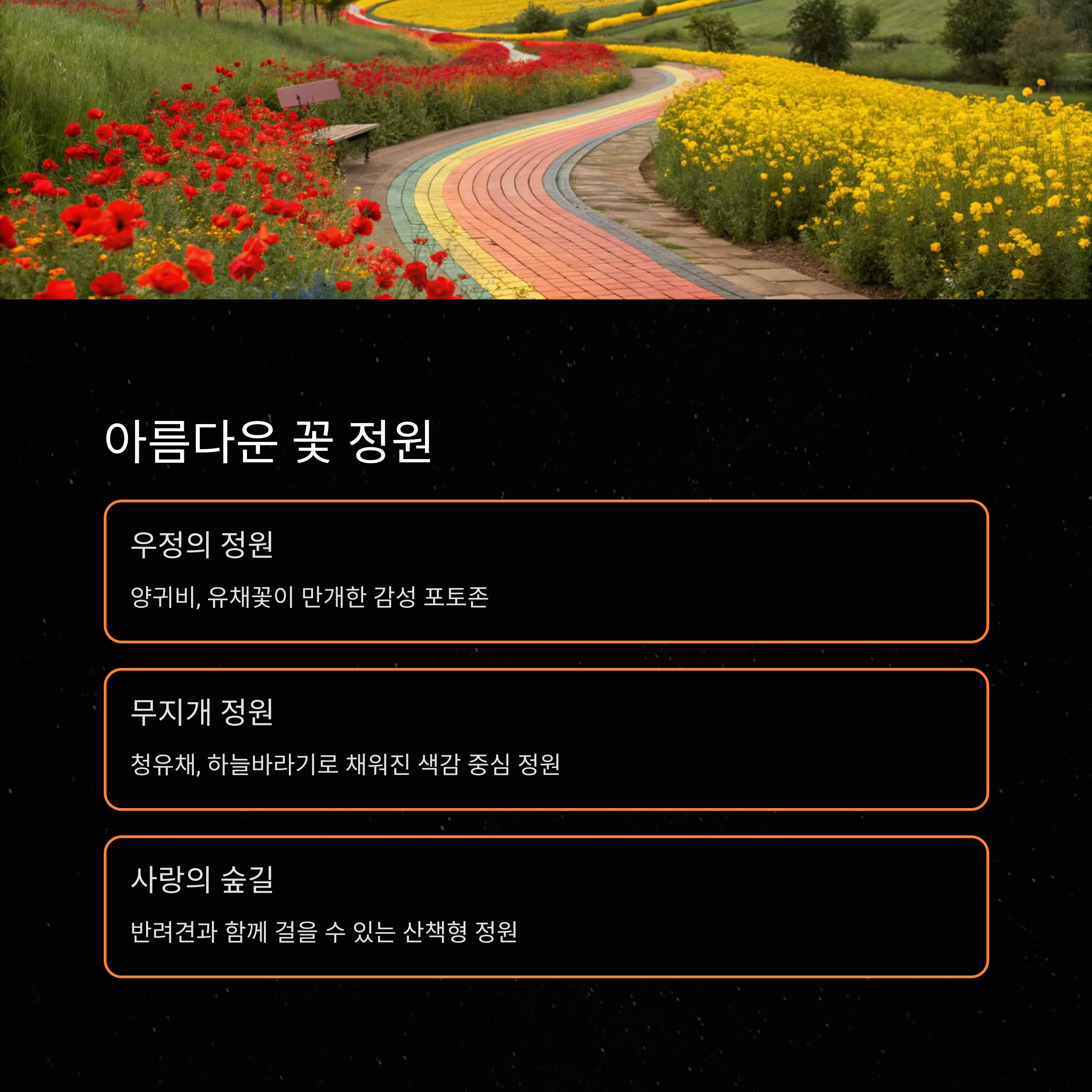 | 우정의 정원 | 양귀비, 유채 | 감성 포토존 중심 |