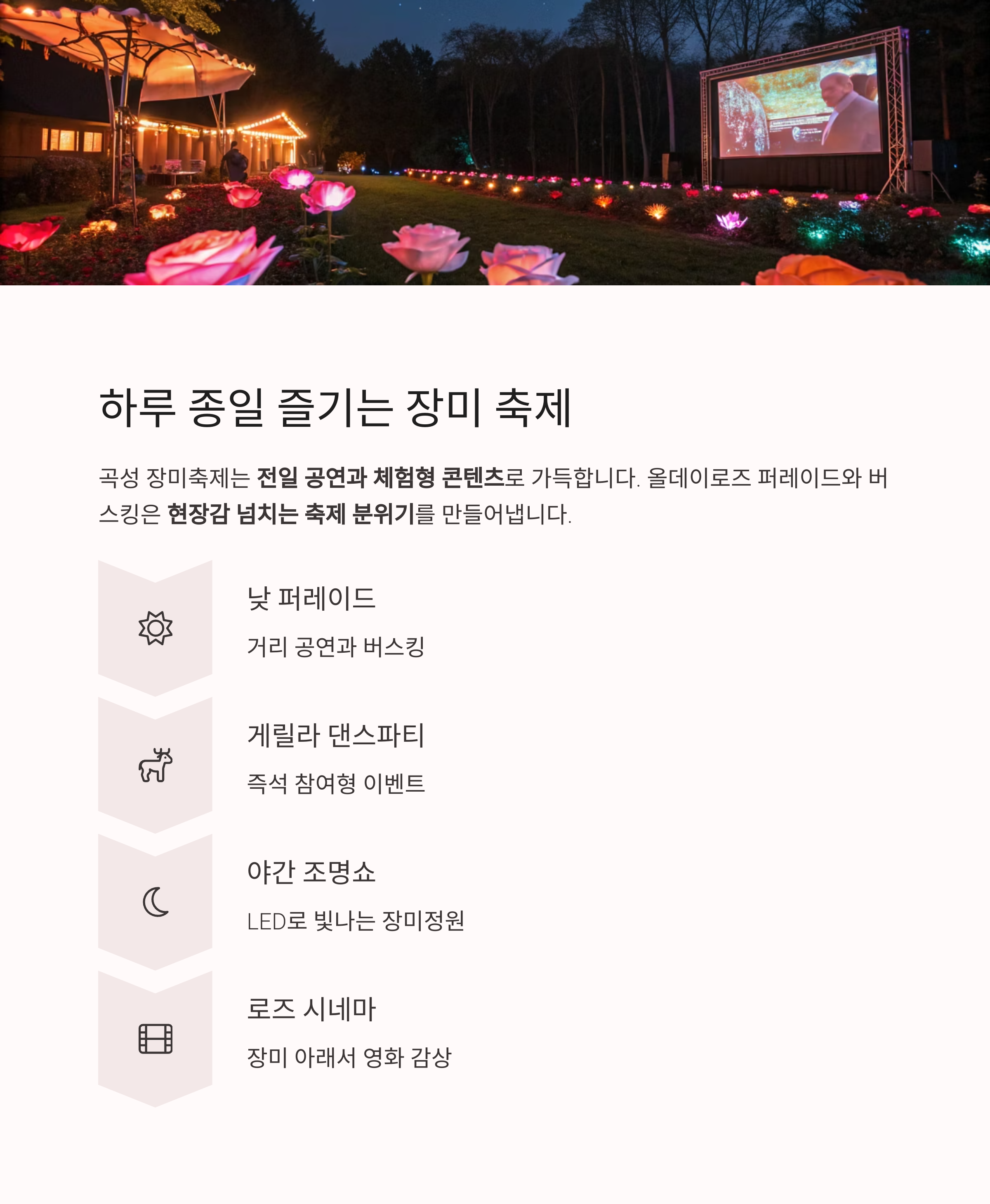 곡성 장미축제의 매력은 전일 공연과 체험형 콘텐츠에 있습니다.