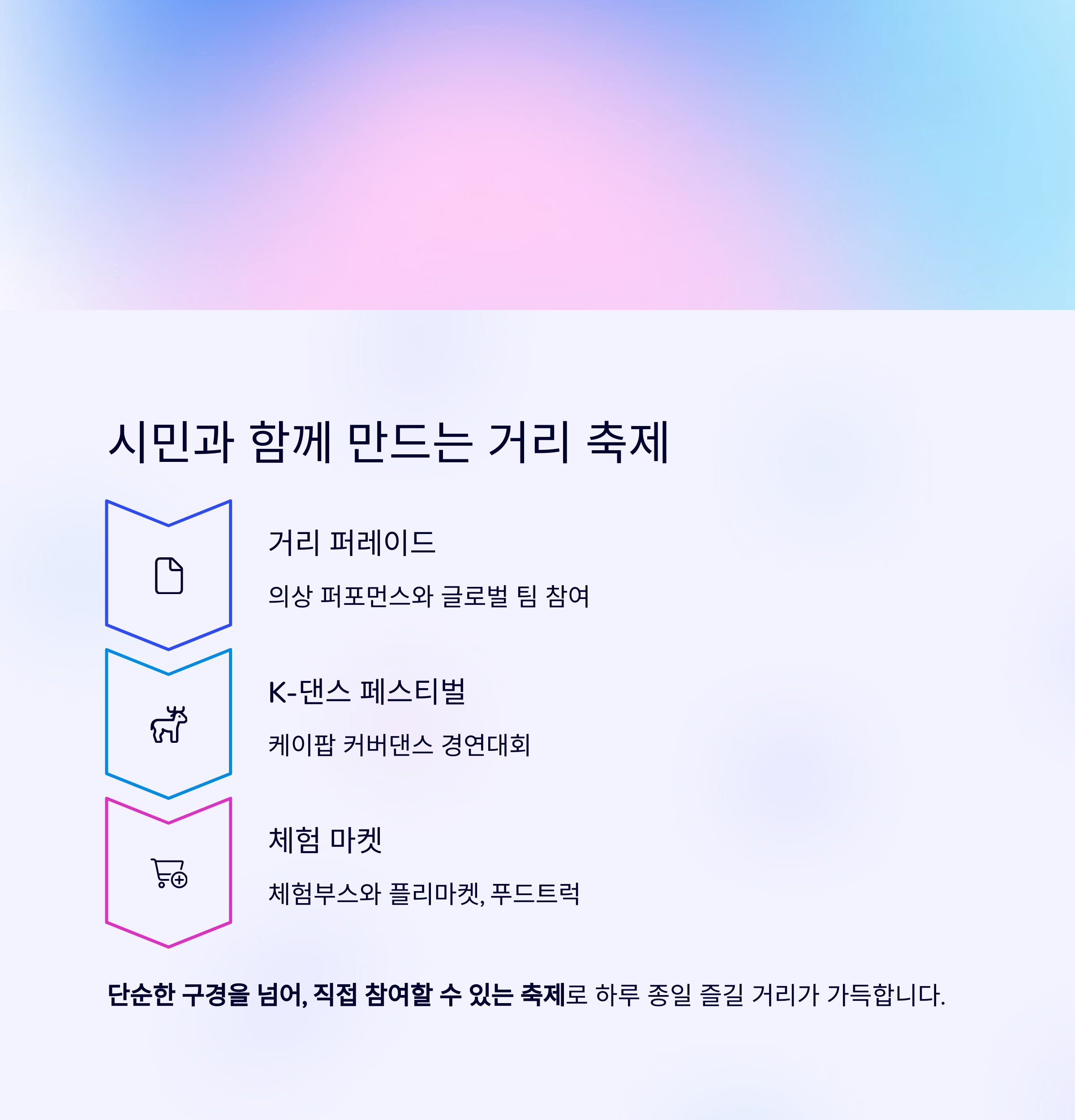 | 거리 퍼레이드 | 의상 퍼포먼스, 글로벌 팀 참여 | 역동적 분위기 |