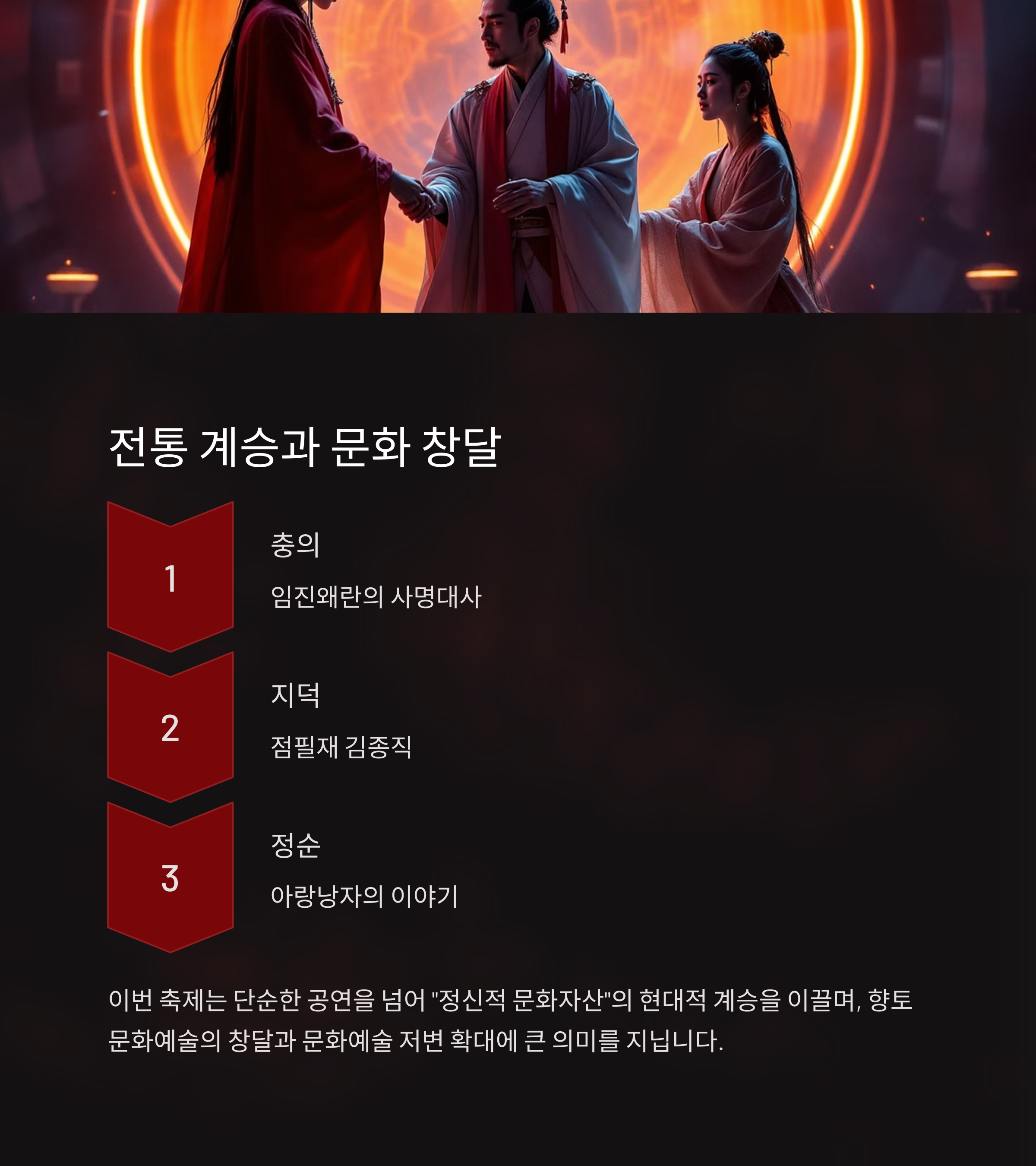 충의, 지덕, 정순의 가치를 담은 공연 콘텐츠가 돋보입니다.