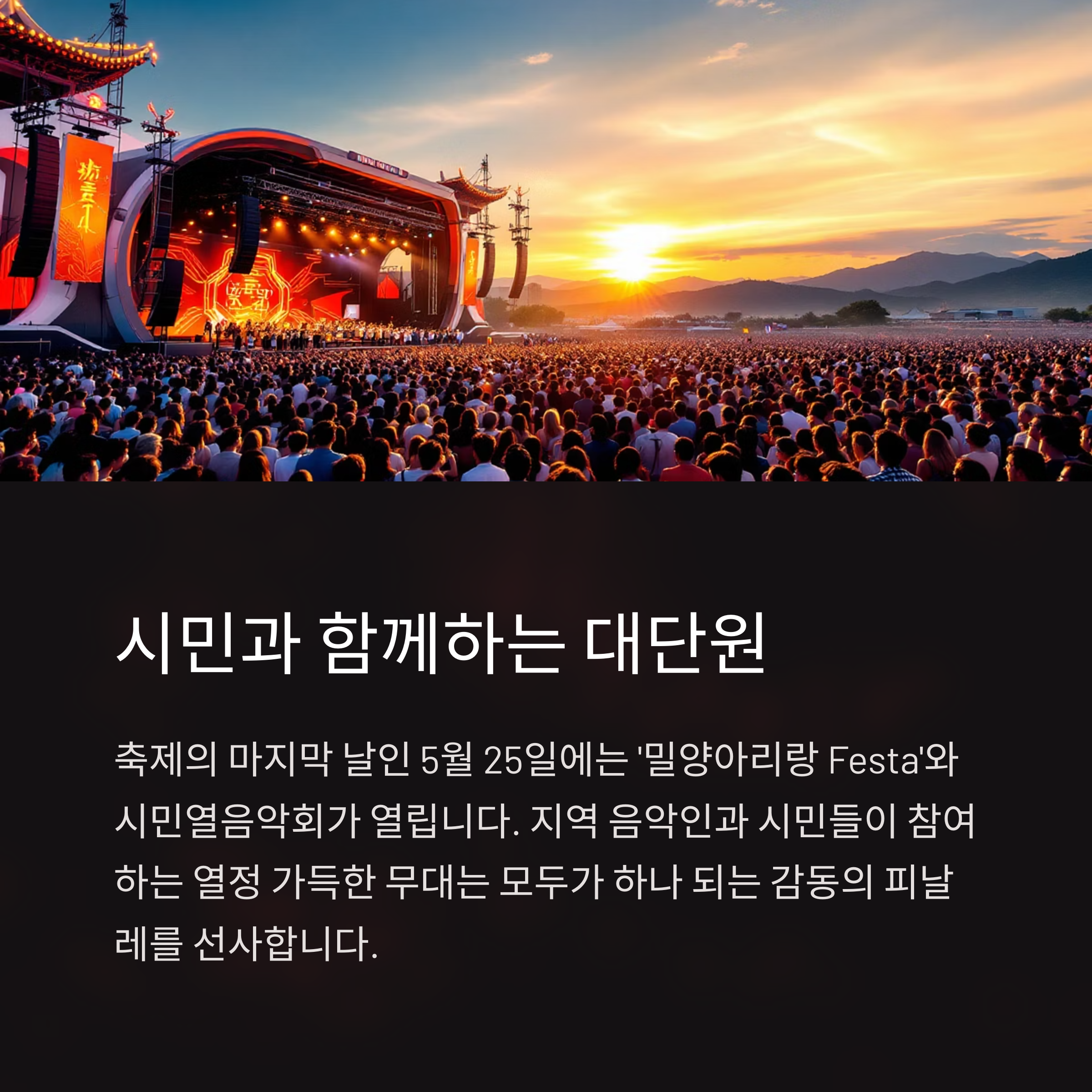 축제의 마지막 날인 5월 25일에는 ‘밀양아리랑 Festa’와 시민열음악회가 열립니다.