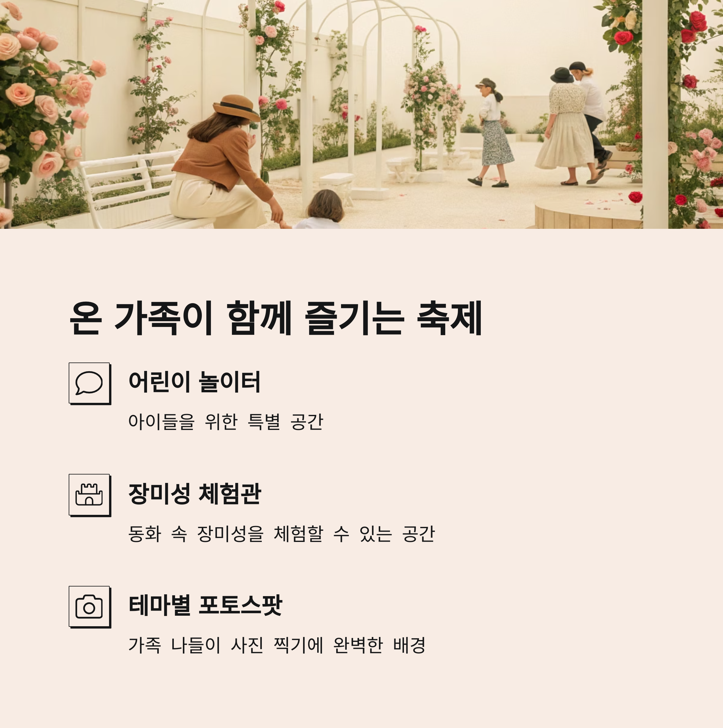| 키즈존 | 가족 중심 구성 | 놀이터, 동화 장미 |