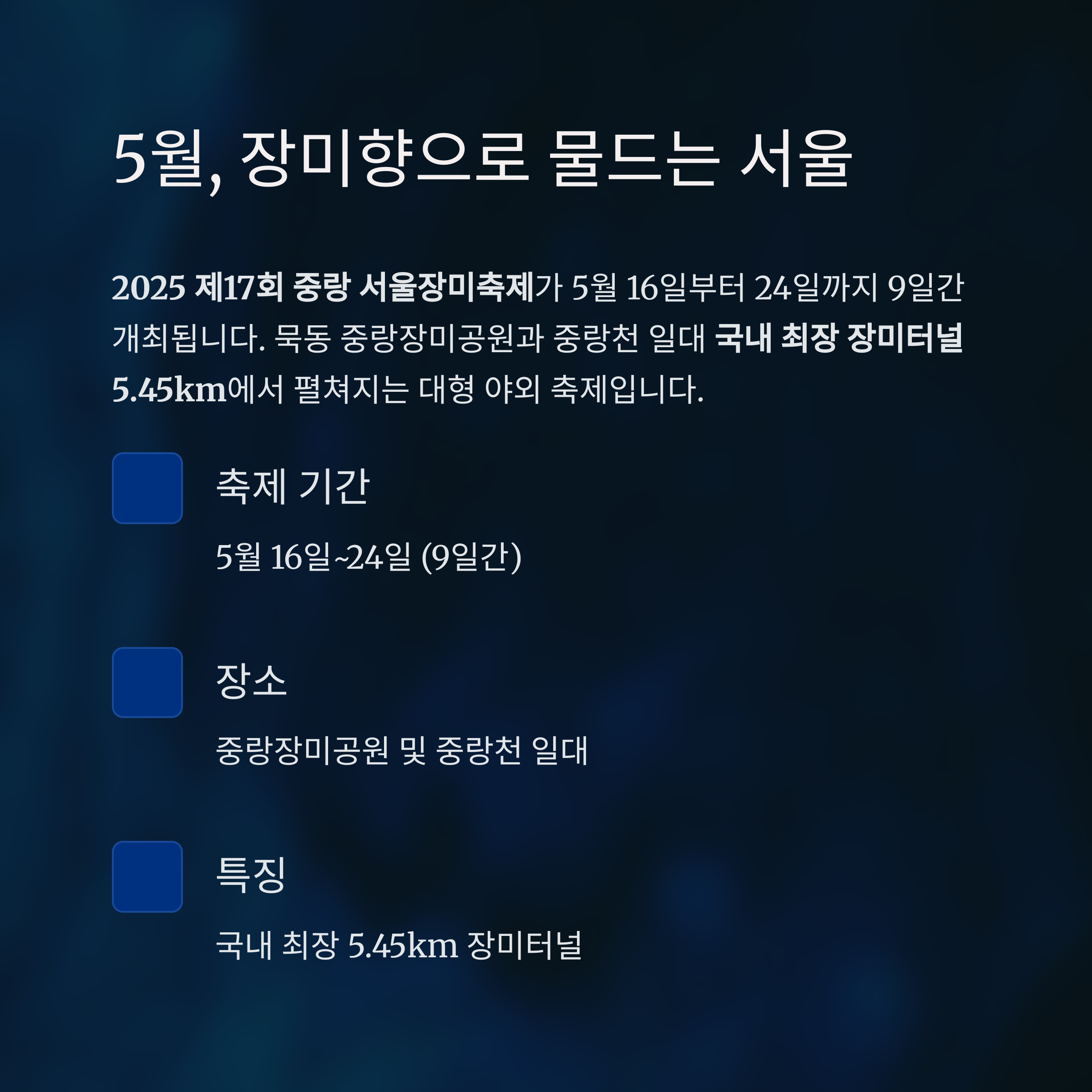 ‘2025 제17회 중랑 서울장미축제’가 오는 5월 16일부터 24일까지 9일간 개최됩니다.