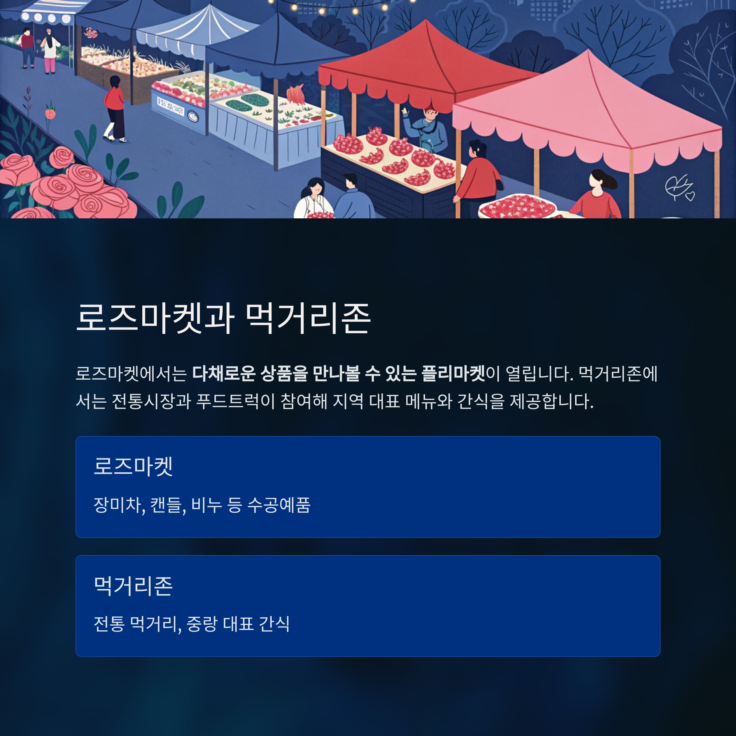 | 로즈마켓 | 장미차, 캔들, 비누 등 수공예품 |
