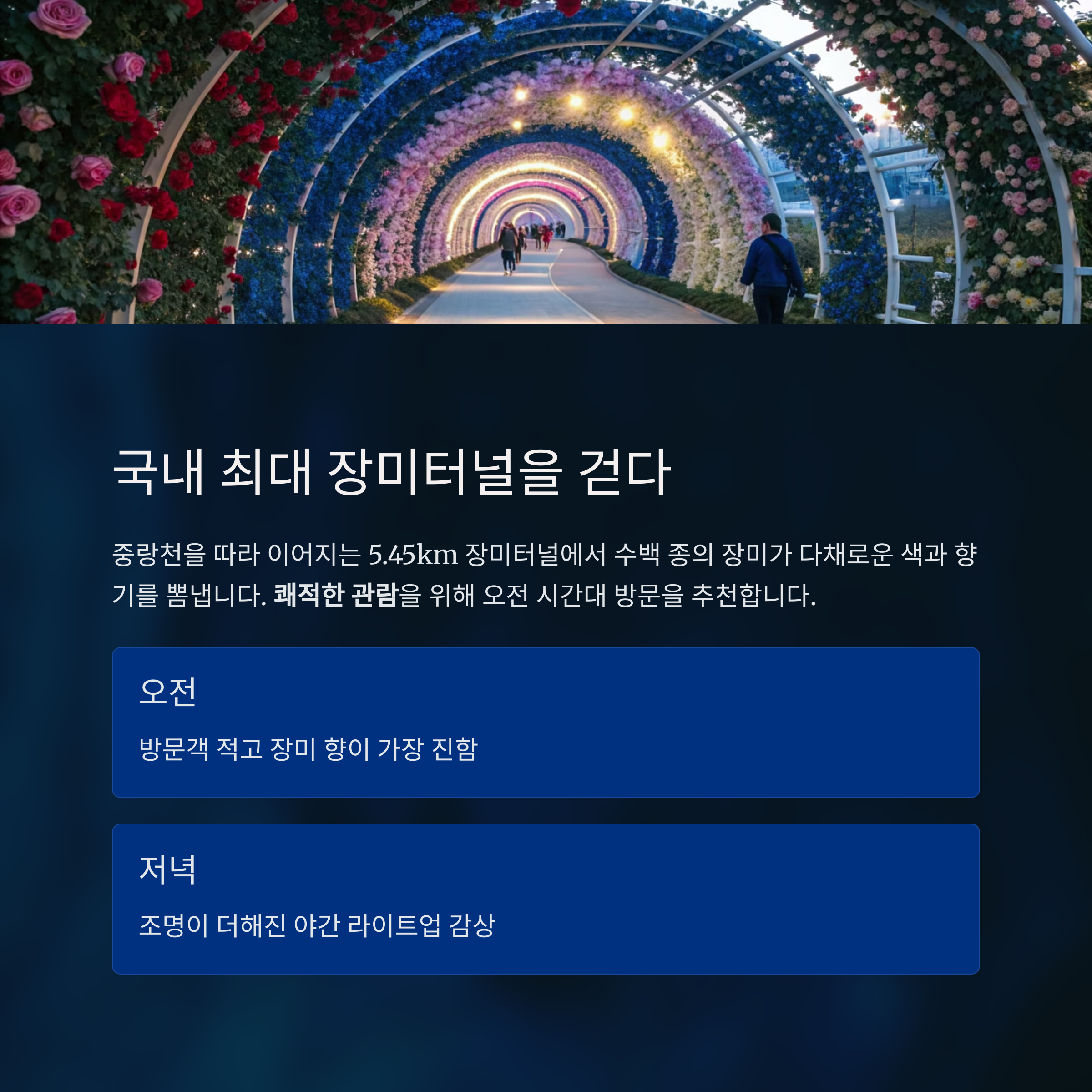 총 5.45km에 달하는 국내 최장 장미터널에서 펼쳐지는 대형 야외 축제로,