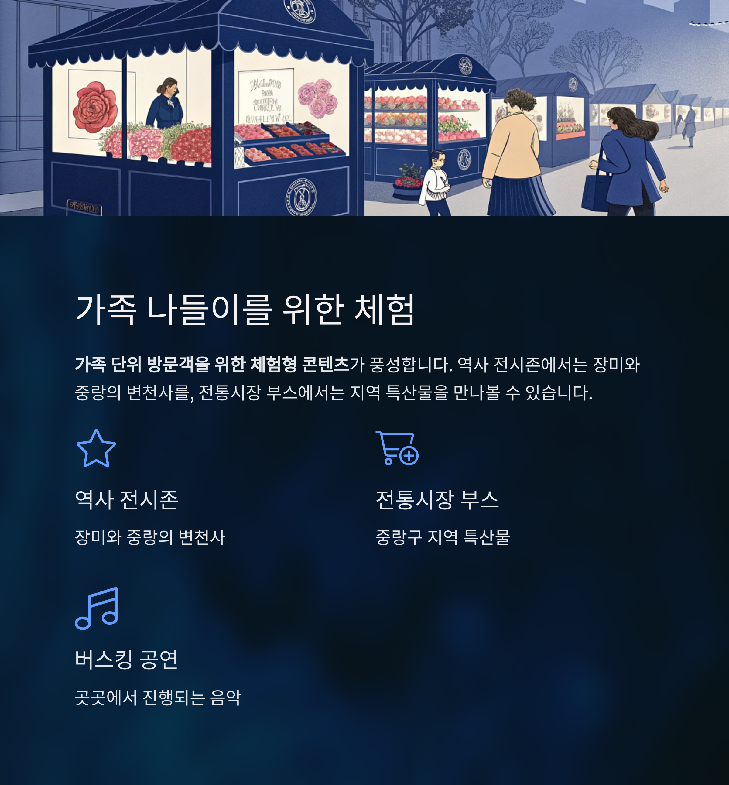 온 가족이 즐길 수 있는 다양한 문화행사와 마켓, 퍼포먼스가 준비되어 있습니다.
