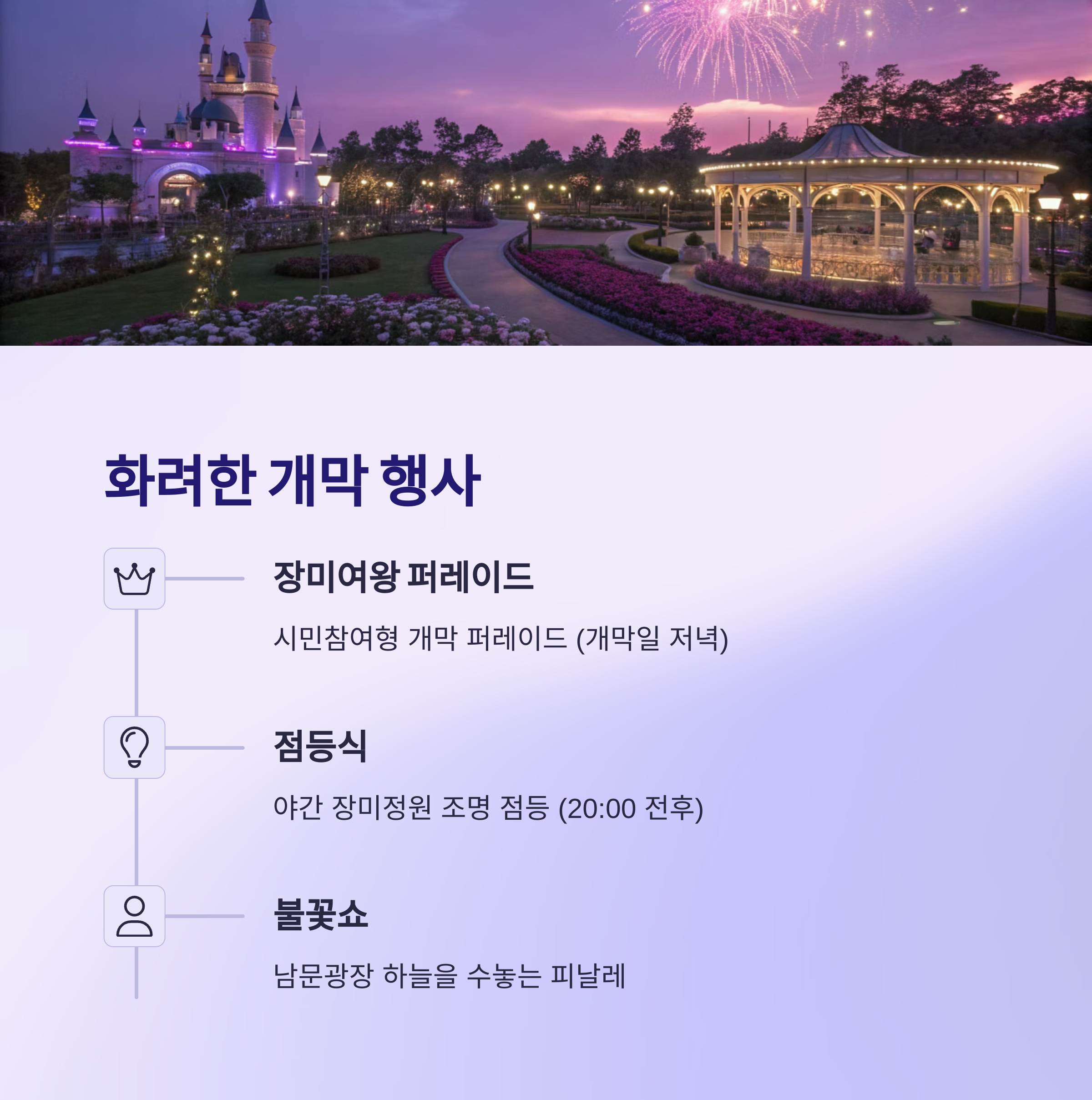 | 점등식 | 야간 장미정원 조명 점등 | 20:00 전후 |