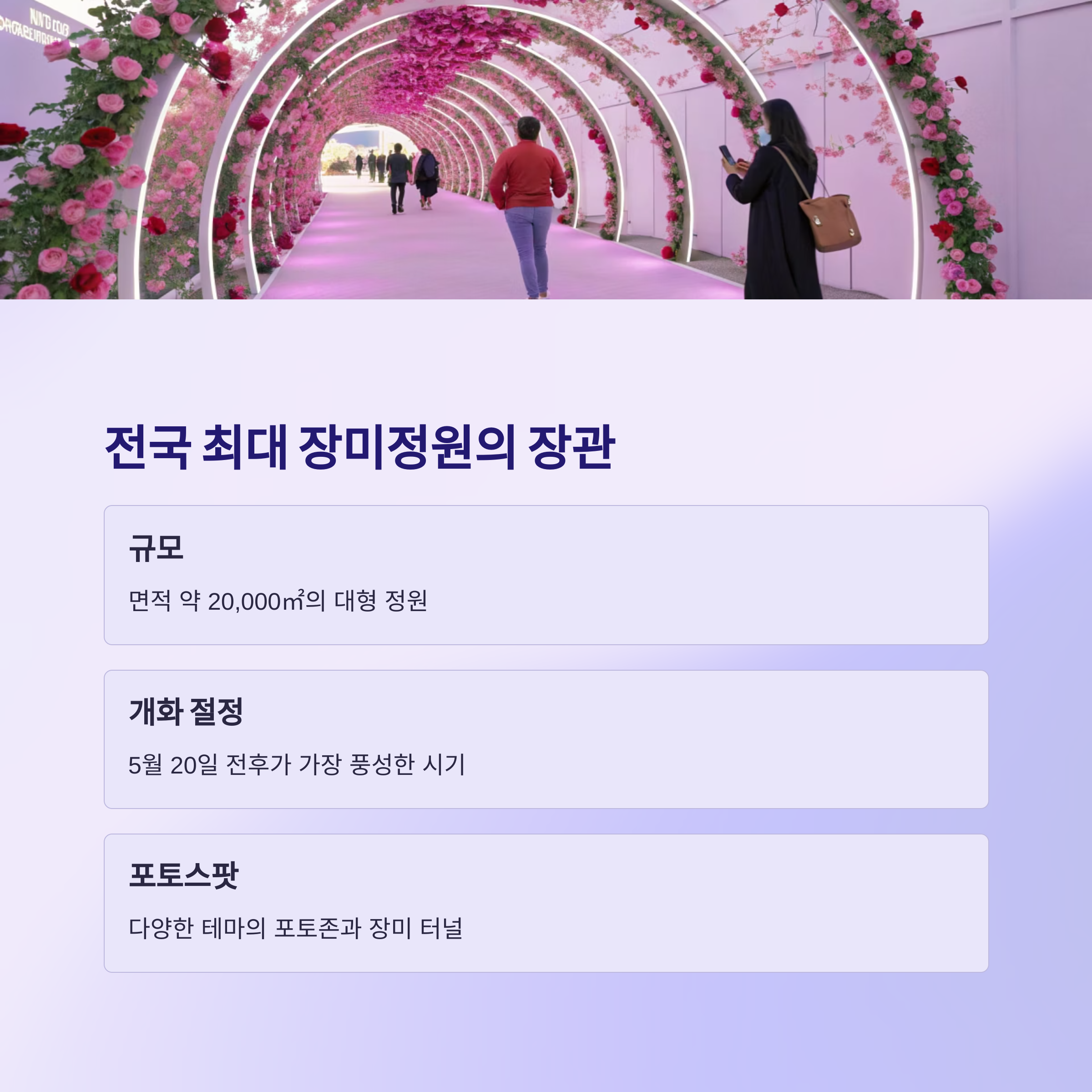정원 곳곳에는 다양한 테마의 포토존과 장미 터널, 조형물이 설치되어