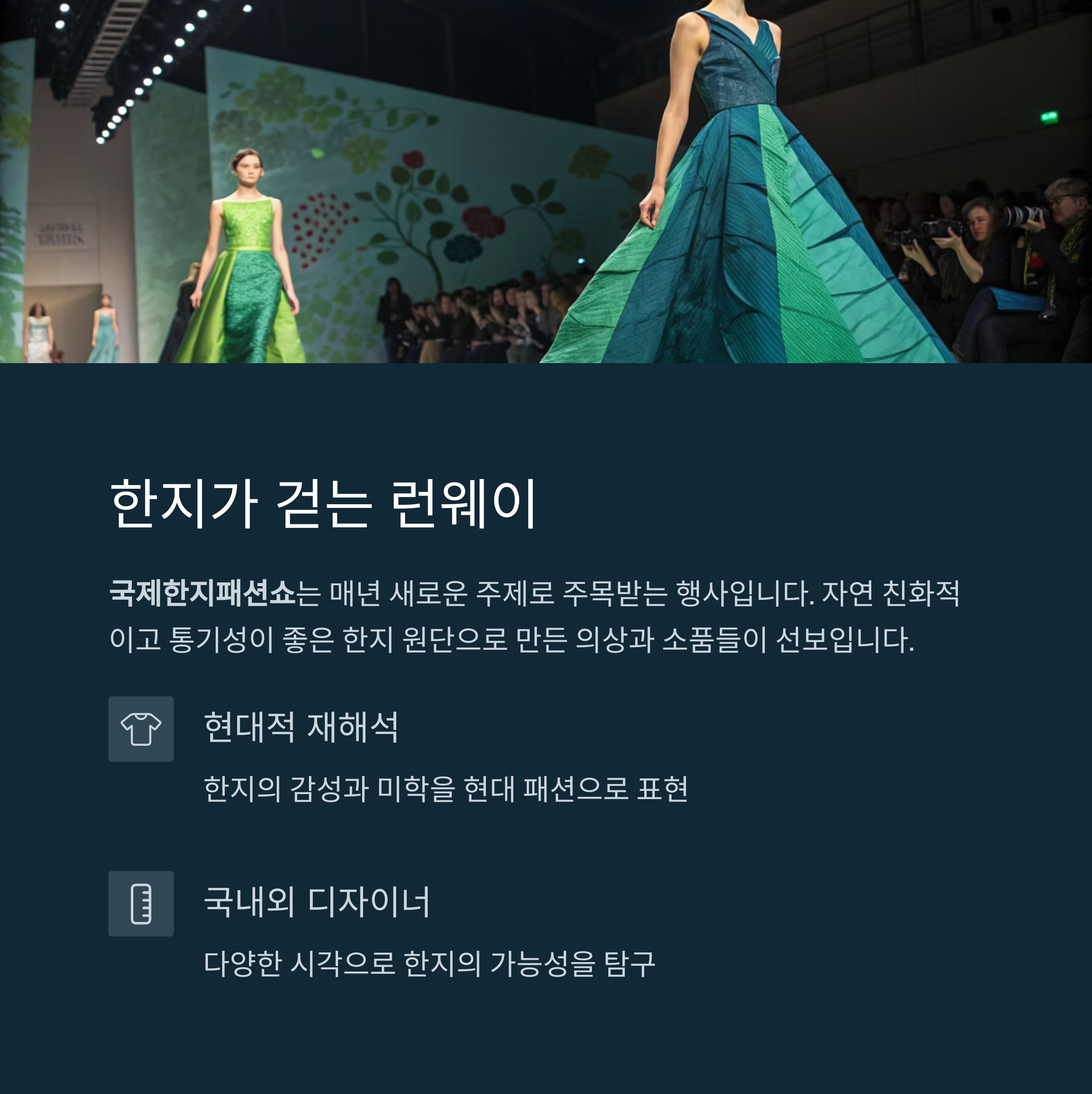 한지의 가능성을 패션이라는 언어로 풀어내는 장면을 직접 만나볼 수 있습니다.