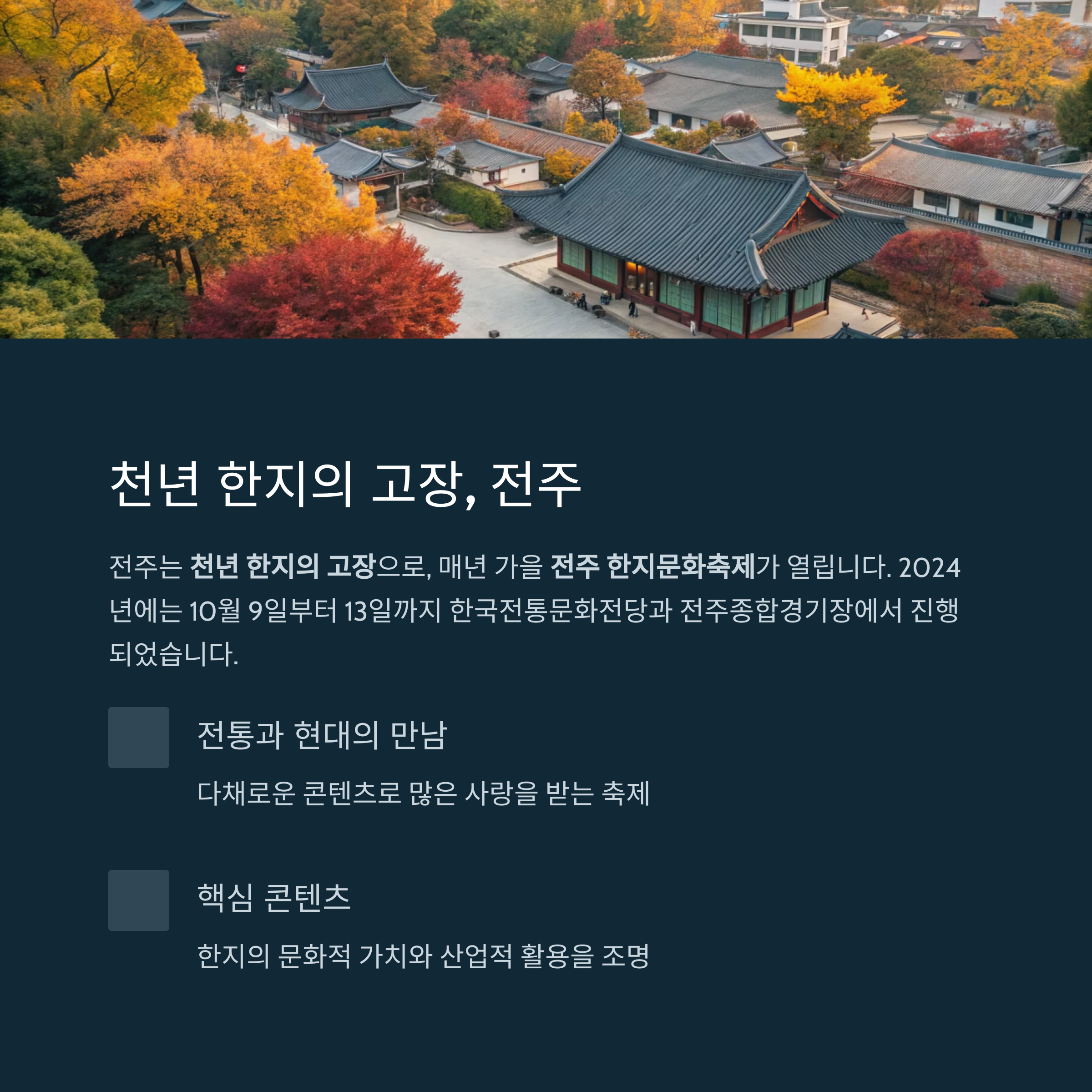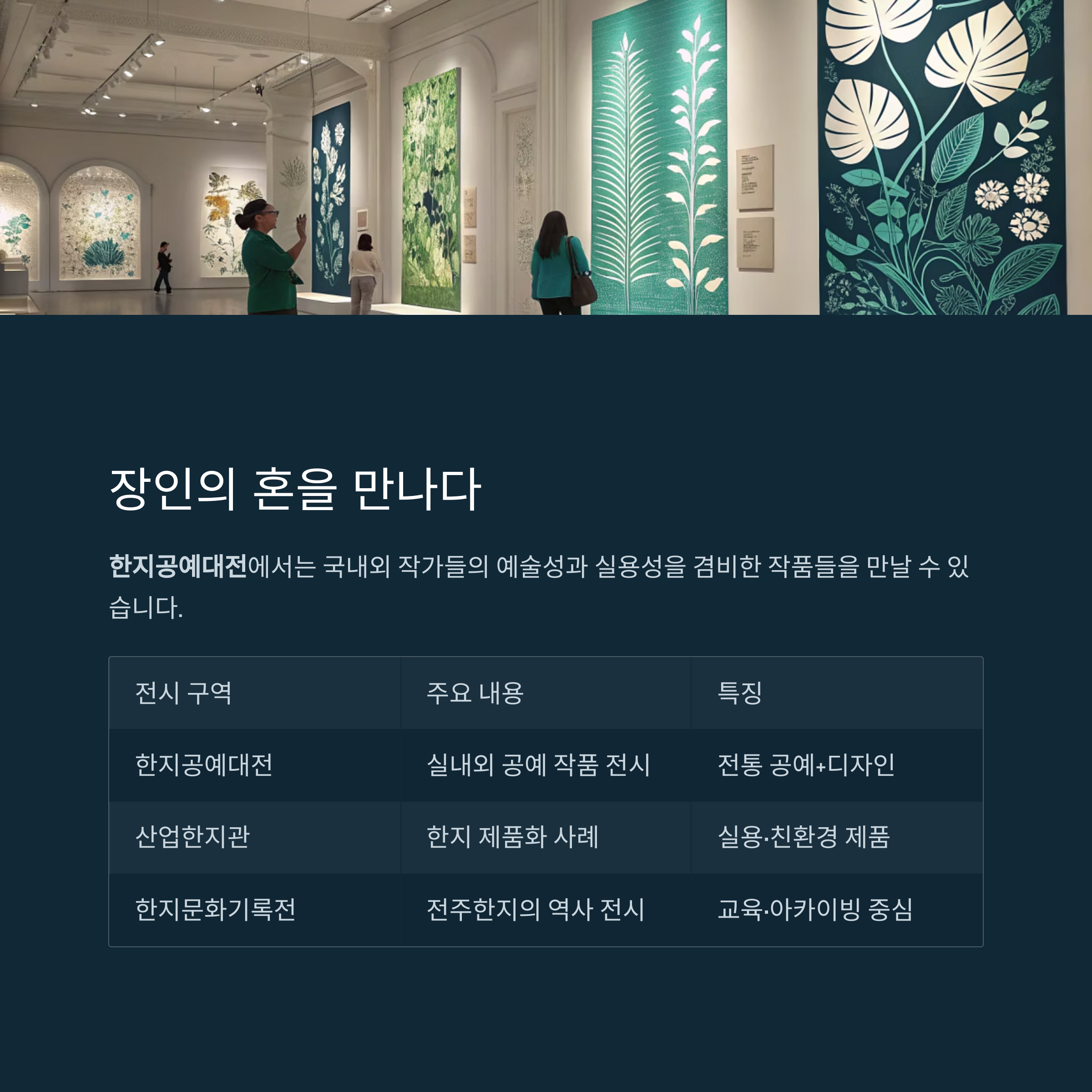 | 한지문화기록전 | 전주한지의 역사 전시 | 교육·아카이빙 중심 |