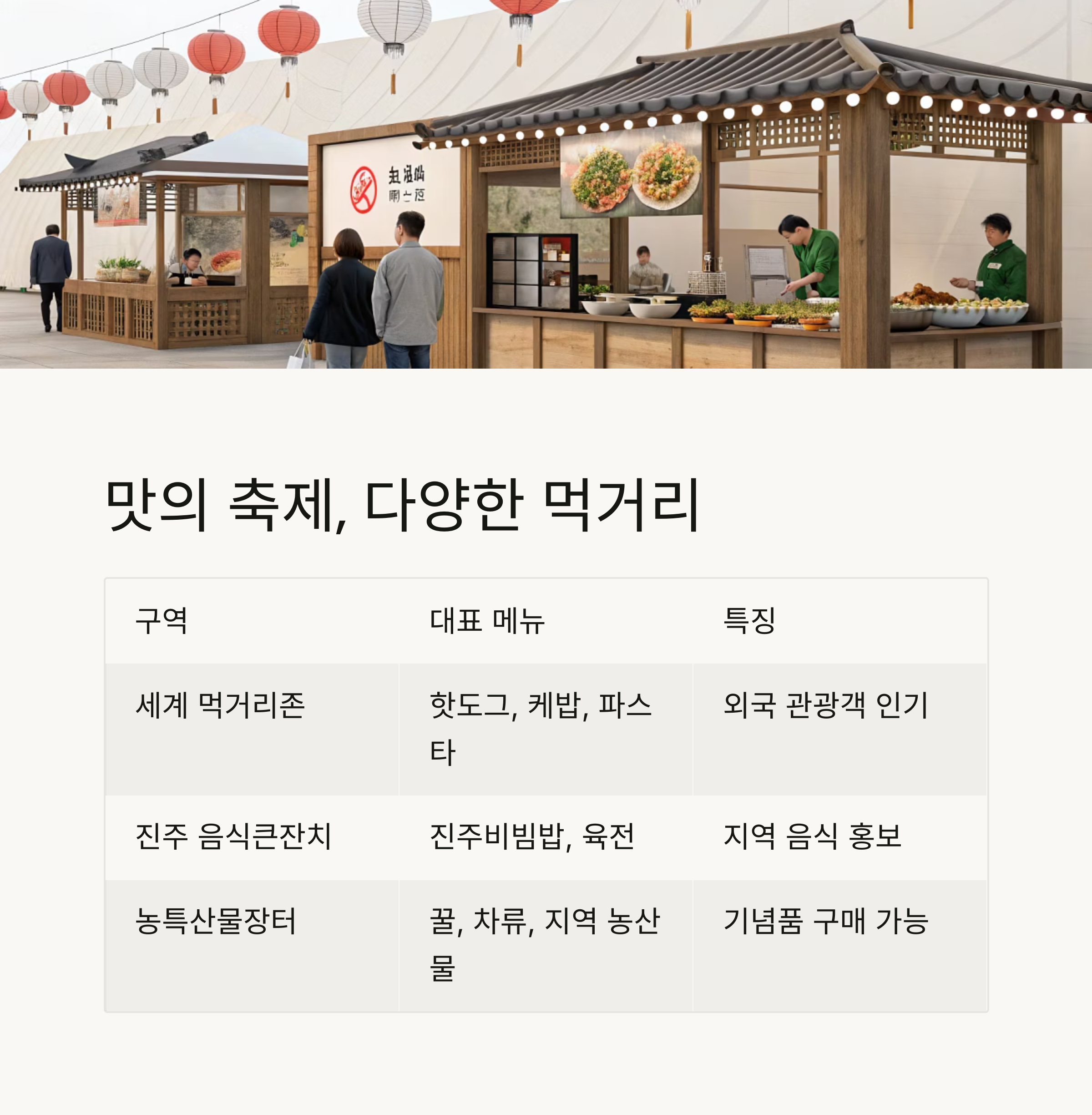 | 진주 음식큰잔치 | 진주비빔밥, 육전 | 지역 음식 홍보 |