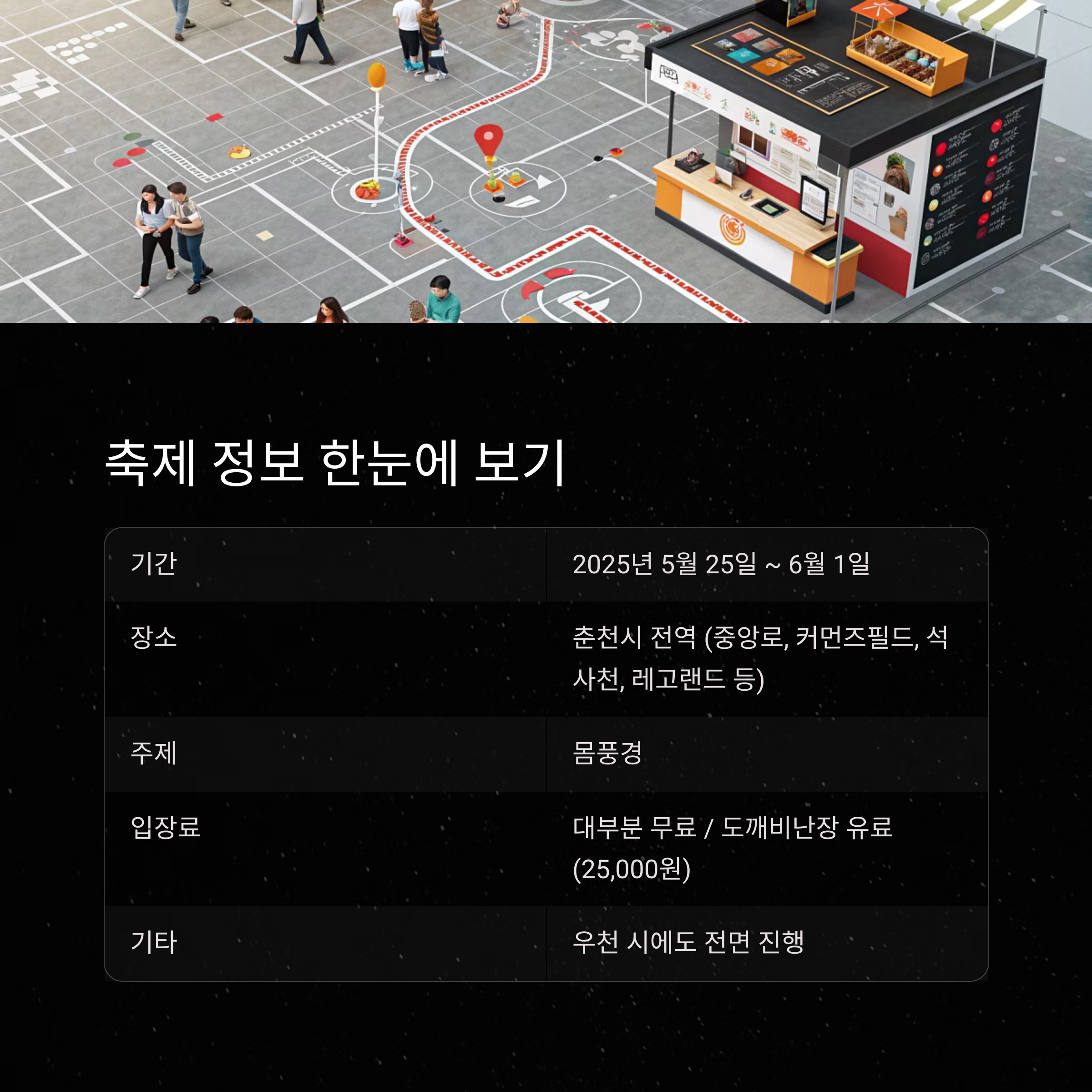 | 장소 | 춘천시 전역 (중앙로, 커먼즈필드, 석사천, 레고랜드 등) |