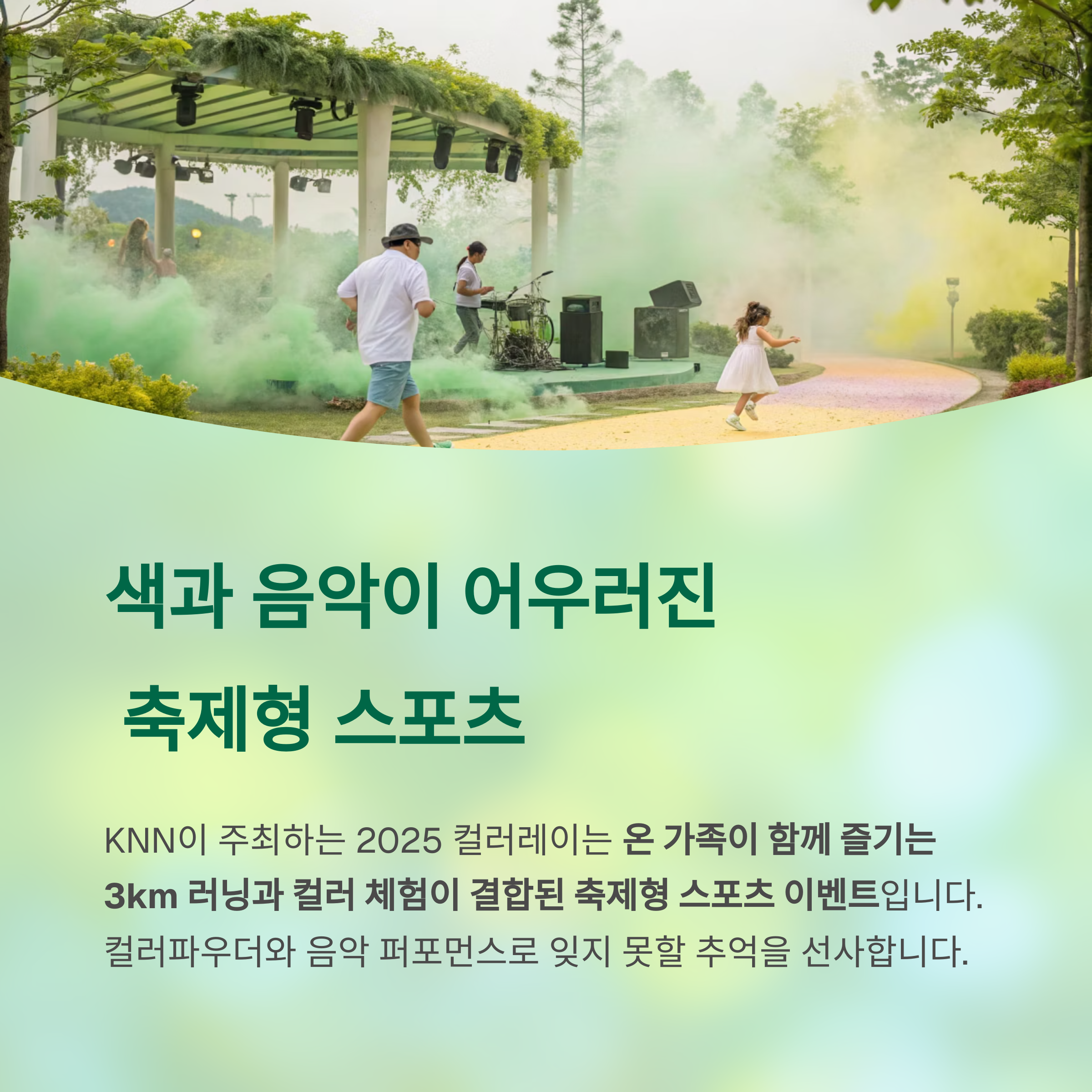 온 가족이 함께 즐기는 3km 러닝과 컬러 체험이 결합된 축제형 스포츠 이벤트입니다.