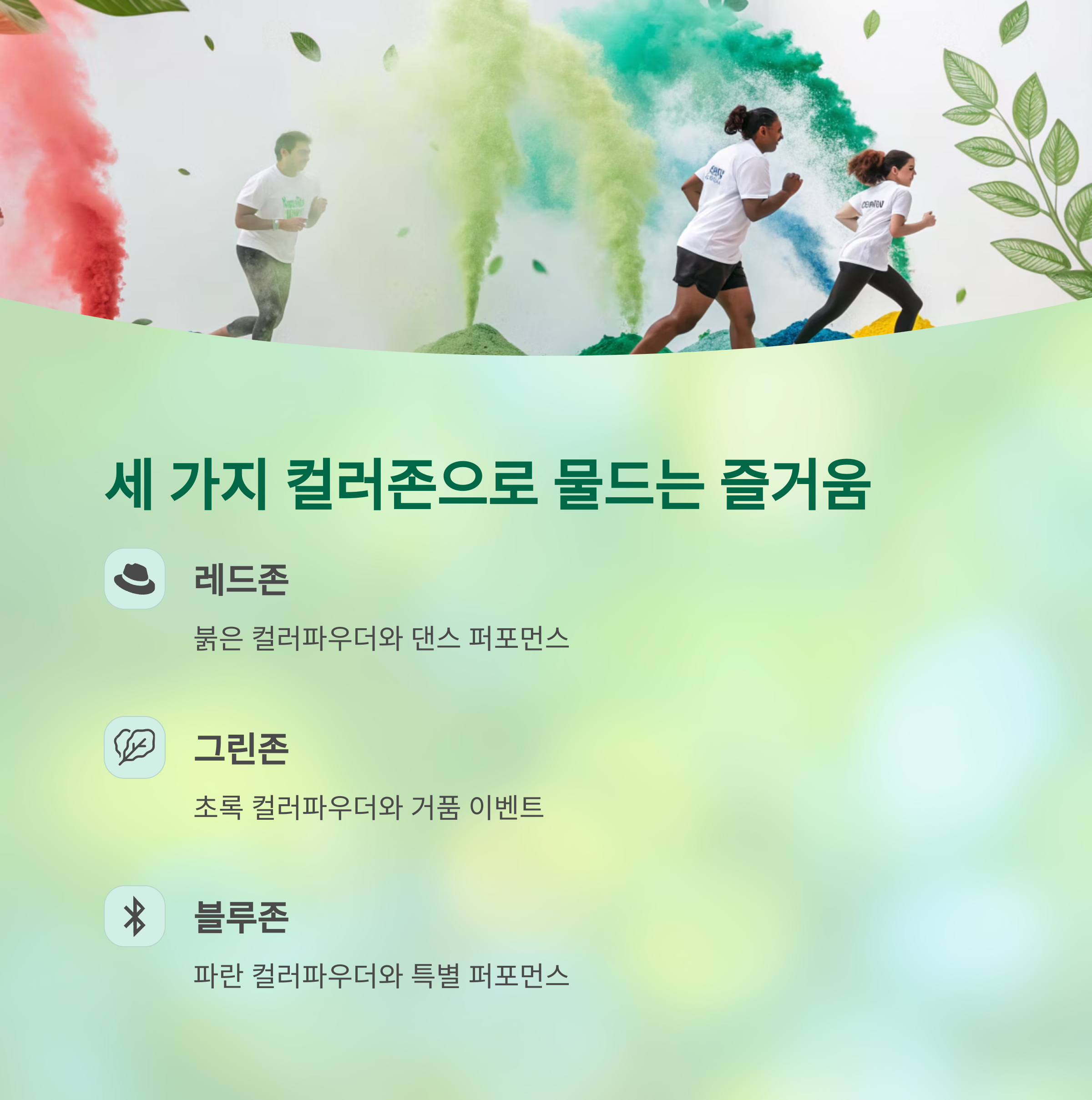 각종 컬러파우더와 음악 퍼포먼스가 더해져, 참가자들에게 잊지 못할 추억을 선사합니다.
